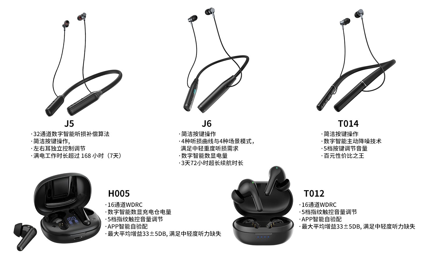 A. Neckband design, long-term wear without compression B. Easy button operation, independent control and adjustment of left and right ears C.5 types of hearing loss curves and 4 scene modes to meet the needs of moderate to severe hearing loss D.7 days and 168 hours of ultra long battery life