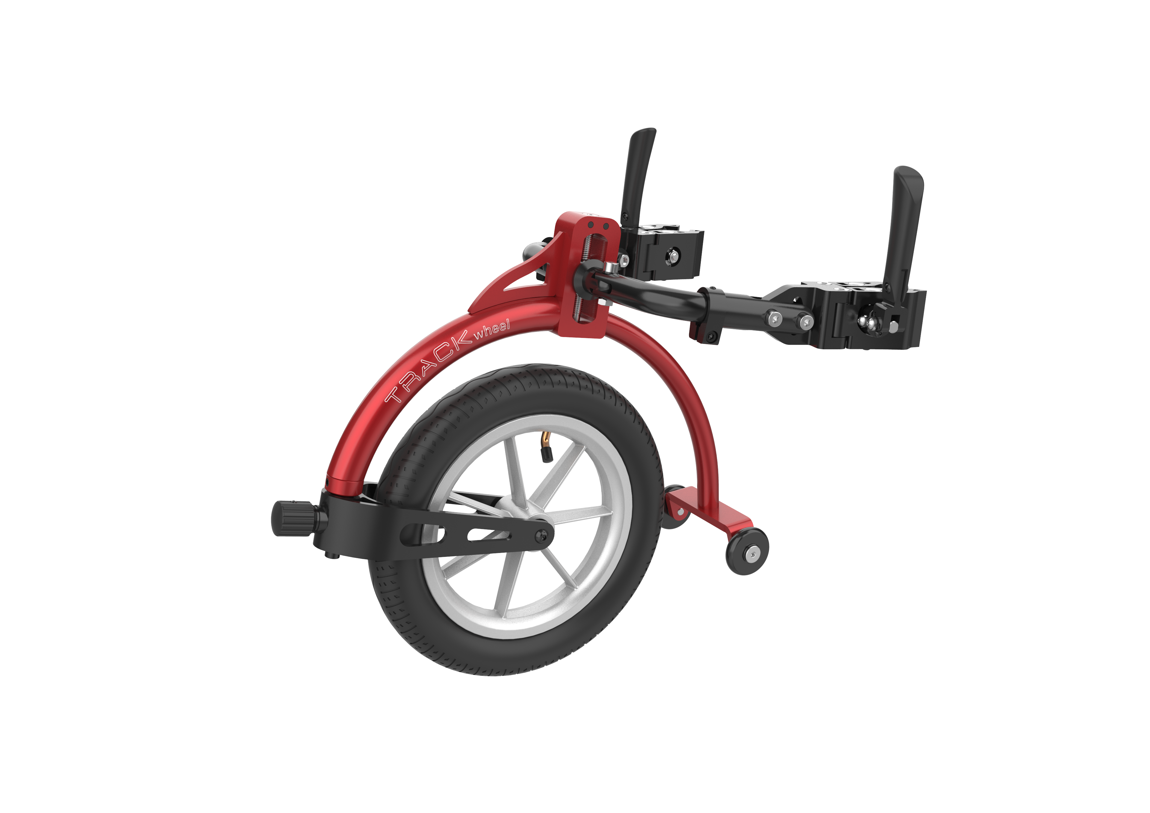 TRACK WHEEL CONVERT YOUR WHEELCHAIR INTO AN AGILE TRICYCLE The outdoor front wheel TRACK WHEEL is the ideal companion to drive on difficult terrains where you normally can't drive with your wheelchair. The TRACK WHEEL is ultra-light, easy to attach and comfortable. Whether you are crossing bumpy roads in the city, travelling over cycling and hiking trails, or exploring rough nature trails – with the outdoor front wheel TRACK WHEEL you can move effortlessly on a wide range of terrains. Thanks to the 12” TRACK WHEEL the castor wheels are raised, and the wheelchair is tilted slightly backwards. The rolling resistance is noticeably reduced. As a result you can achieve higher speed, longer distances, better directional stability and maneuverability. Enjoy a more comfortable driving experience. Once your TRACK WHEEL has been correctly adjusted to fit your wheelchair, it can be fastened within a few seconds!