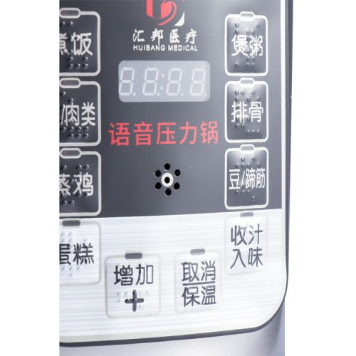 每一個操作按鍵都具有語音報讀功能,以及盲文點標識和LED指示燈;具有LED四位數碼顯示屏,可顯示時間信息;材質:不銹鋼外殼,不銹鋼蓋子,食品級塑料蓋子防護,鋁合金內膽;具有一鍵式功能選擇鍵:具有煮飯、煲粥、魚/內類、排骨、蒸雞、豆/蹄筋、蛋糕、收汁入味八種功能可選擇。