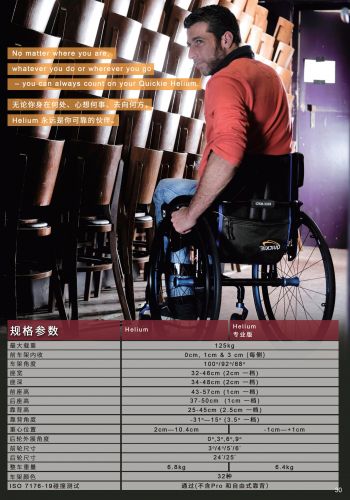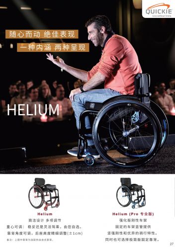 Helium設計簡潔,車架多項調節,其重心位置可依用戶需求調整,后座高度可精細化調整 Helium(PRO專業版)強化版剛性車架,固定車架豎管提供堅強剛性和優異的騎行特性。 Helium 為一款剛性設計機款,分Helium和Helium Pro兩個機款,車架采用航空級別鋁合金材質,堅固、輕便,車身與輪轂顏色多種顏色可選,多種選配件可選,是一款可依用戶需求量身定制的剛性輪椅