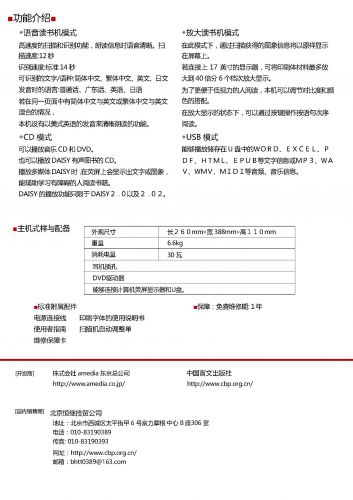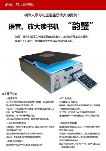 1. 語音閱讀模式:把掃描讀入的文章數據以優雅易聽的語音讀出。 2. 放大閱讀模式(助視器功能):把掃描讀入的圖像數據在屏幕上放大顯示,最大放大倍率40倍(17寸顯示器), 6級放大顯示;可調整對比度和顏色;同時也可以使用操作鍵進行語音讀出。 3. CD模式:可以播放CD/DVD/Daisy光盤(Daisy2.0及2.02)。 4. USB模式:可以播放U盤中的Word、Excel、Pdf、Htm