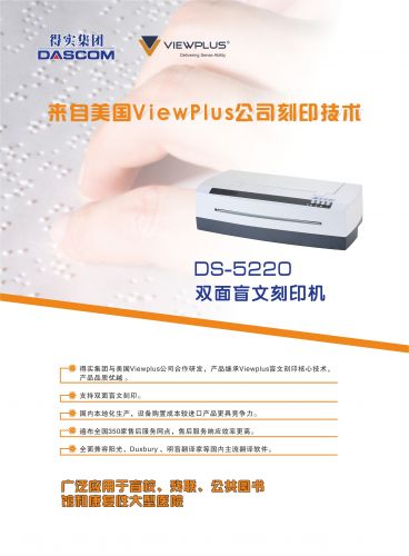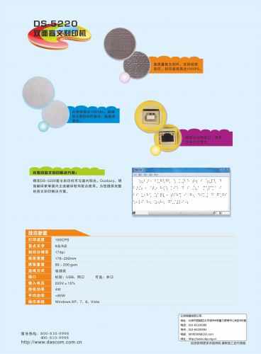 打印速度:每秒100字符打印方式:雙面打印分辨率:100 DPI盲文點:可調:重,中,輕3D盲文點:7個等級紙張寬度:176 - 292 mm紙張類型:連續紙紙張重量:90 - 200 gsm接口:1個USB ( 1.1,2.0 ),Ethernet兼容性:Windows 7, 8/8.1, 10尺寸:H*W*D=158*557*275 mm重量:9KG運行環境:•推薦溫度:15至35°C