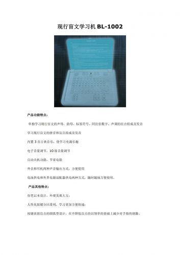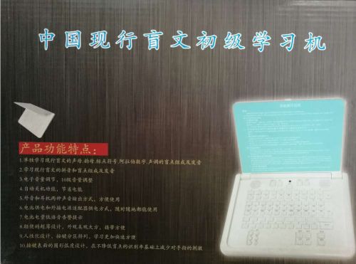 1. 單獨學習現行盲文的聲母、韻母、標簽符號、阿拉伯數字、聲調的盲點組成及發音 2. 學習現行盲文的拼音和盲點組成及發音 3. 內置3首古典音樂,使學習充滿樂趣 4. 電子音量調節,10級音量調節 5. 自動關機功能,節省電能 6. 外音和耳機兩種聲音輸出方式,方便使用 7. 電池供電和外界電源適配器供電兩種方式,隨時隨地方便使用 8. 仿筆記本設計,外觀美觀大方; 9. 人性化按鍵分區排列,學習