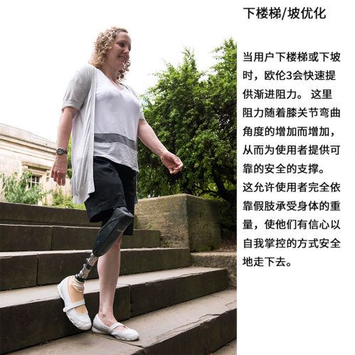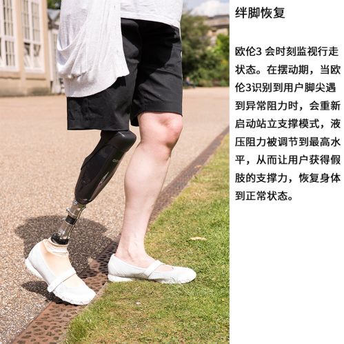 歐倫3代全智能膝關節采用了動作智能系統,新增單車模式、站立鎖定省力功能,更安全的和最佳的漸進步速控制特點,它的新一代傳感器實時感應膝關節的動作情況,并快速對數據進行處理和反饋。由于歐倫三代會依據關節屈曲的角度的增加而增加支撐阻力,因此支撐穩定性能與安全性能得以大大提高,是其他智能關節所不具備的。在行走時,它的微處理器會控制氣壓輸出部分,對擺動期中的不同步速提供良好的控制,無論快速還是漫步;