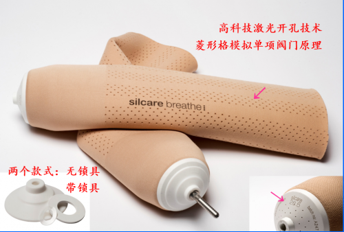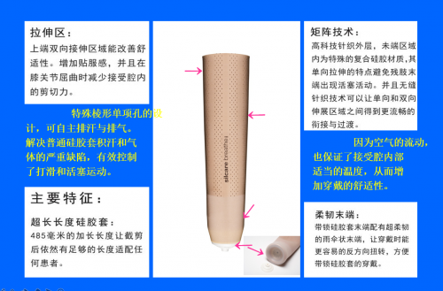 "擁有專利技術的排汗硅膠套,革命性地解決了用戶使用假肢的出汗帶來的體驗問題; 小腿截肢使用 ; 矩陣式分布的激光精密加工小孔,可主動排出空氣和水分 ; 無縫雙向拉伸,外形美觀的同時倍感舒適 ; 基于柔性技術的表面處理,可改善皮膚接觸剪應力 ; 單向氣閥的使用,實現與殘肢的完美貼合與運動跟隨性;"