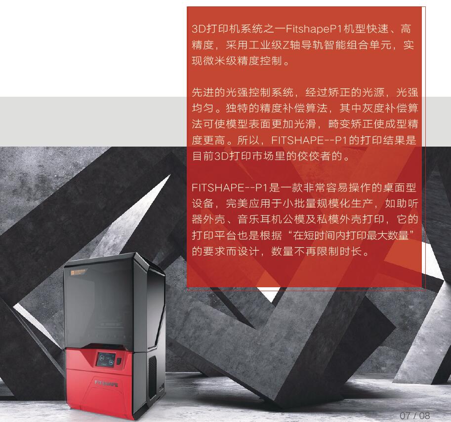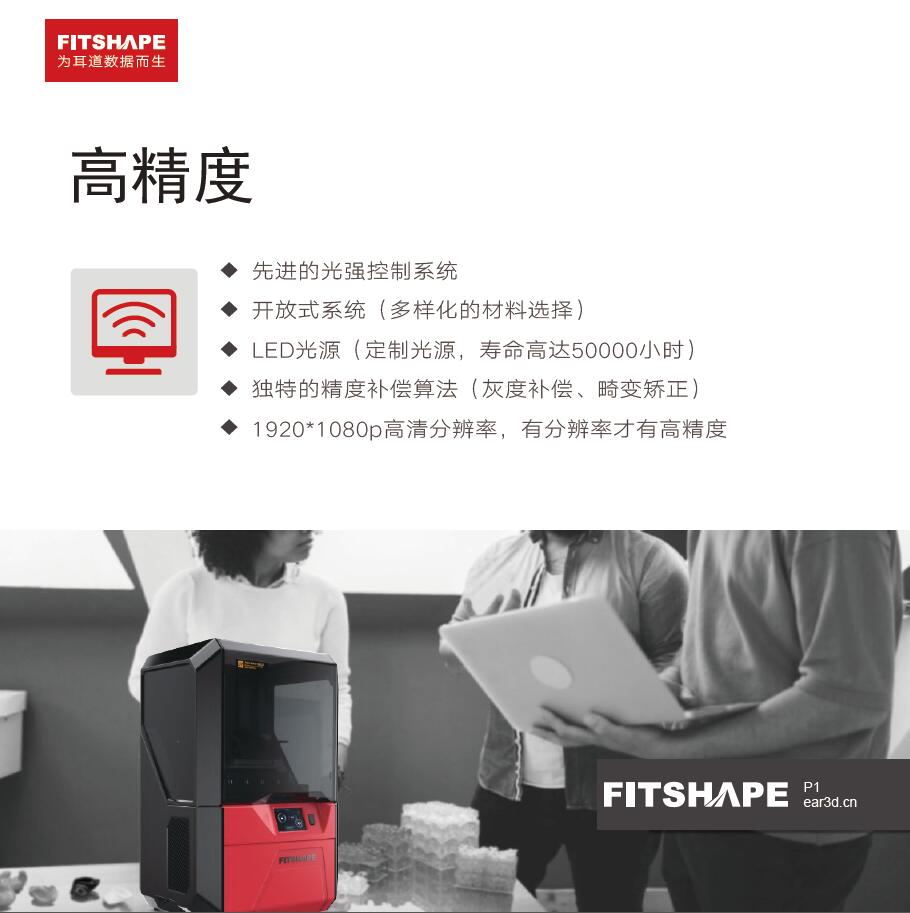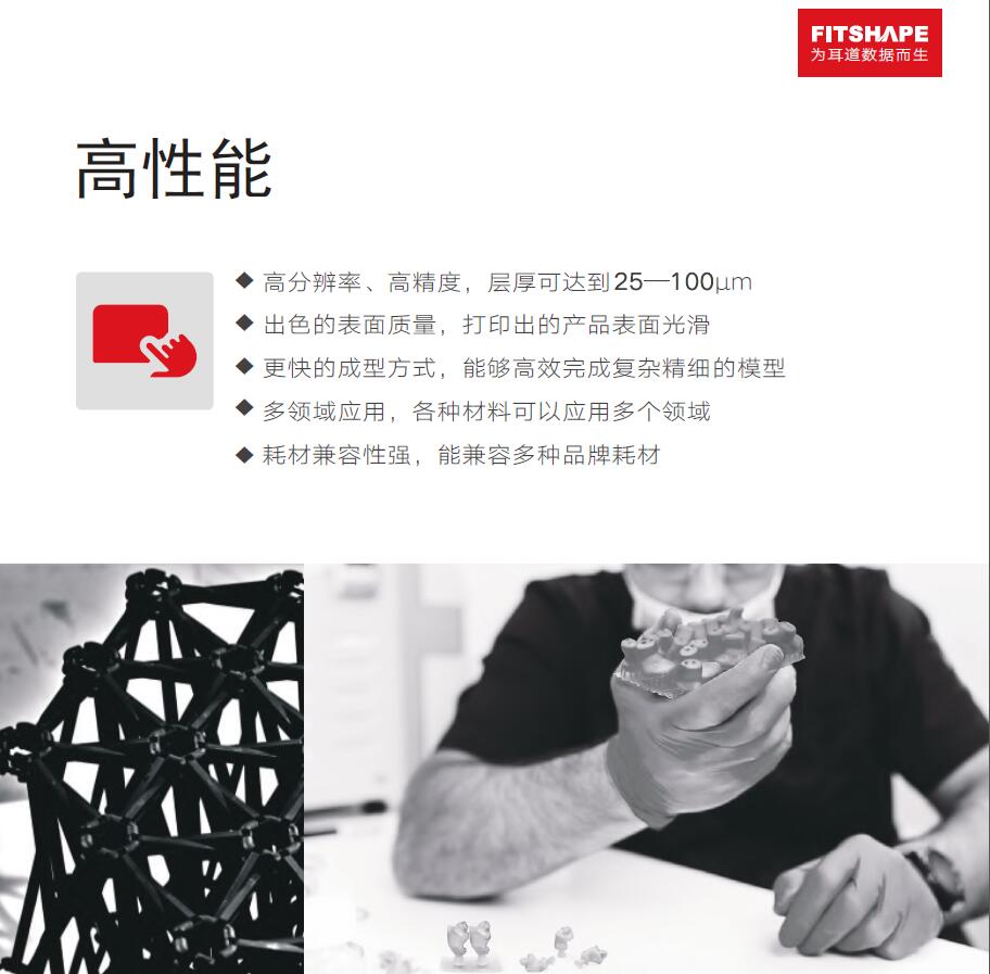Fitshape 3D打印機,應“短時間內打印最大數量”而生,操作便捷,完美應用于小批量規模生產,如助聽器外殼、音樂耳機公模及私模外殼打印。 先進的光強控制系統,經過矯正光源,使模型表面更加光滑,并實現微米級精度控制。