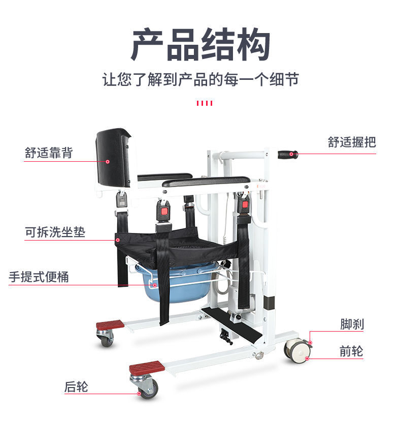 移動式半癱移位機,適用于:半癱/行動能力弱 主要功能:將病人在床、馬桶、沙發之間轉移,載人在室內室外移動輔助上汽車