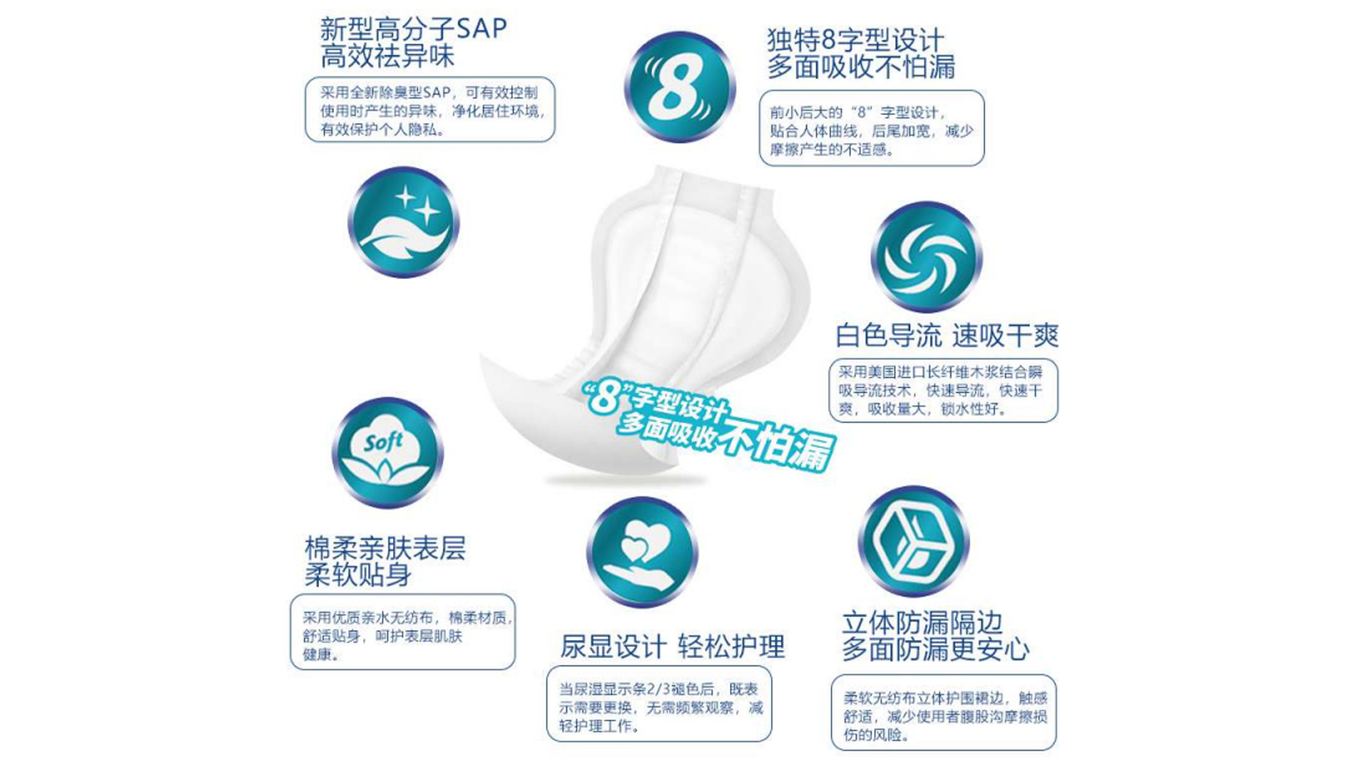 獨特8字型設計 前小后大的“8”字型設計,更貼合人體曲線,后尾加寬 多面吸收不怕漏 白色導流層 速吸干爽,吸收量大,鎖水性好 表層干爽舒適 祛異味高分子 可有效控制使用時產生的異味(中和氨氣 ) 高效祛異味 親膚表層柔軟貼身 采用優質親水無紡布,綿柔材質 舒適貼身,更好的呵護表層肌膚健康 立體防漏隔邊 減少使用者腹股溝摩擦損傷的風險 有效防止尿液和稀便側漏