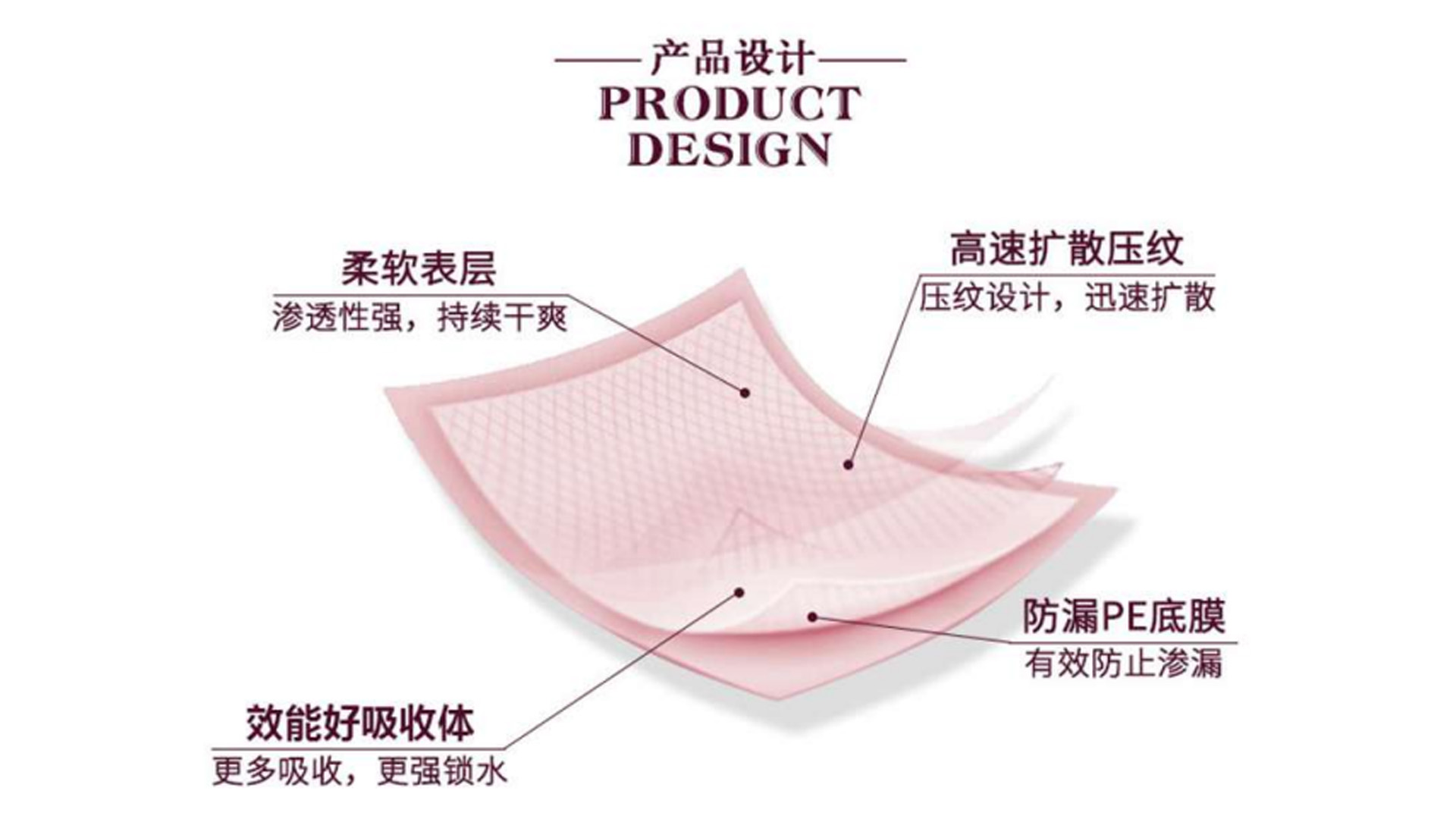 采用優質親水性無紡布,觸感柔軟舒適,滲透性強,干爽性好。 采用美國原廠優質絨毛原漿,富含高鎖水性能的SPA,更高吸收量、更強鎖水性。 網狀菱形壓紋導流設計,液體擴散迅速,維持,維持表層的干爽。 有效防止滲漏,減少床單,被褥的換洗次數。