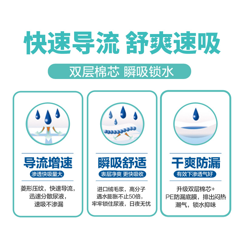 60*90大面積,呵護更周全,使用者安心入睡,照護者減少床鋪換洗工作 舒柔無紡布表層,親膚無刺激,耐用不起球 強力吸收體:加厚棉芯+倍效速吸高分子,強力吸收,有效鎖水,不反滲更安心