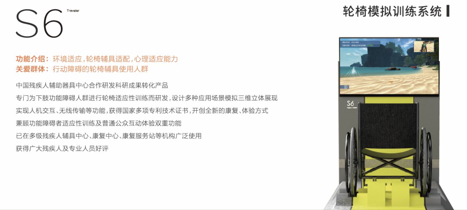 中國殘疾人輔助器具中心聯合研發 專門為下肢功能障礙人群輪椅適應性訓練而研發設計 創新產品——兼具康復訓練及模擬體驗雙重功能 展示多種應用場景,三維立體呈現,實現人機交互、無線傳輸等功能 獲得國家多項專利,開創全新康復、體驗方式