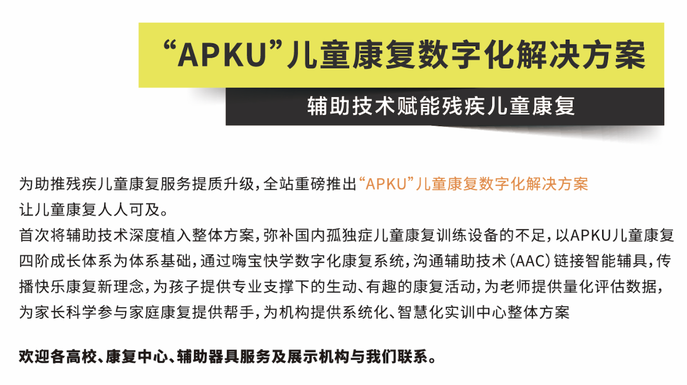 打造智慧化解決方案,讓兒童康復人人可及 為助力兒童康復服務提質升級,全站以輔助技術為核心,賦能兒童康復全過程 推出兒童康復數字化實訓解決方案,本方案以APKU兒童康復四階段成長體系為基礎,通過數字化康復系統及溝通輔助技術(AAC),鏈接感統、言語等多鞥例康復智能化訓練設備,傳播快樂康復新理念。