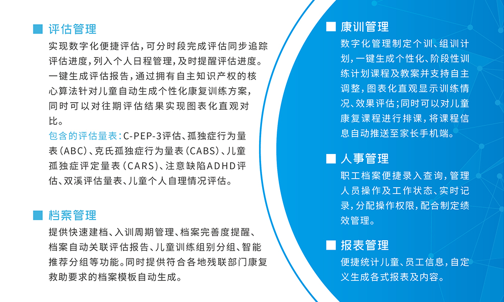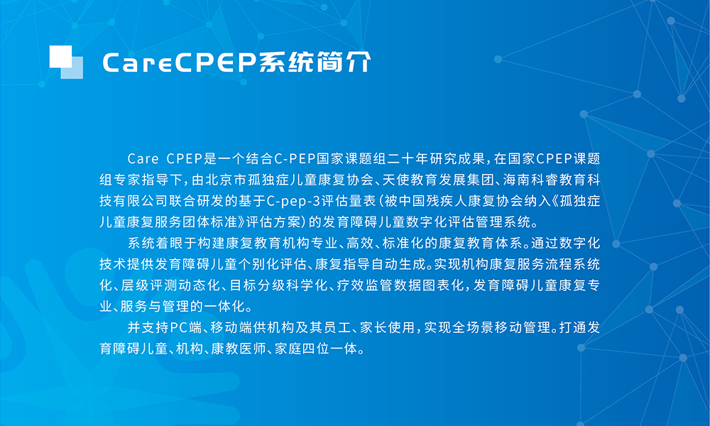 【民非、事業單位可申請免費使用】 Care CPEP是一個結合C-PEP國家課題組二十年研究成果,基于C-pep-3評估量表為核心。集評估管理、康復檔案管理、個別 化訓練管理、小組訓練管理、報表管理、康復指導方案一鍵生成、職工人事管理等功能 的特殊兒童數字化評估管理系統。