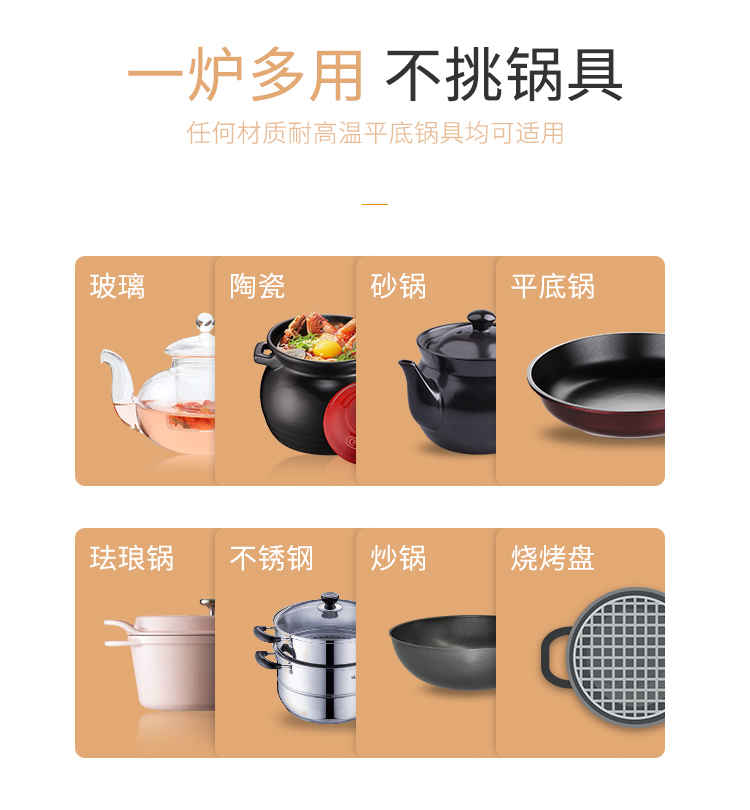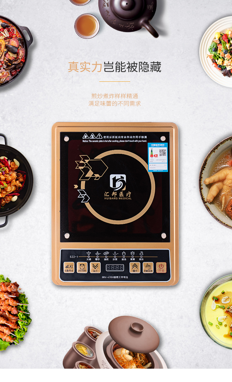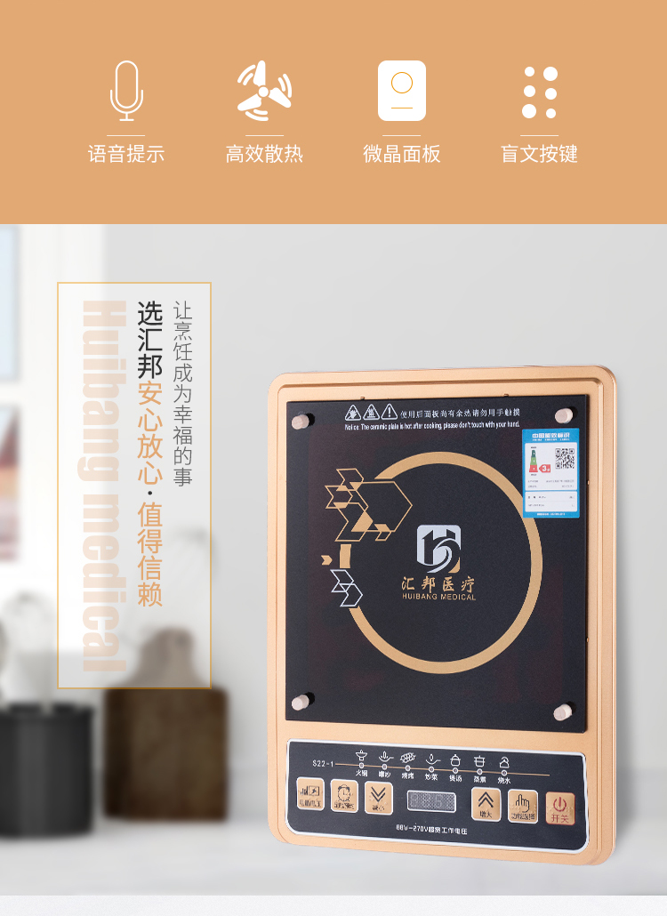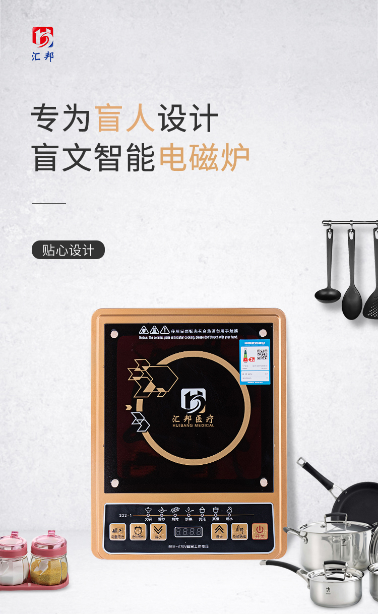 每一個操作按鍵都具有語音報讀功能和盲文點標識;具有“無鍋具”的安全提醒。反復提醒無鍋具后自動斷電關機,安全保護;具有6個操作按鍵:功能選擇鍵、減小鍵、增大鍵、開關鍵、定時預約鍵、電量電壓查詢鍵;具有火鍋、爆炒、燒烤、炒菜、煲湯、蒸煮、燒水、預約、定時九大功能,增大、縮小鍵可讀報相應溫度數。