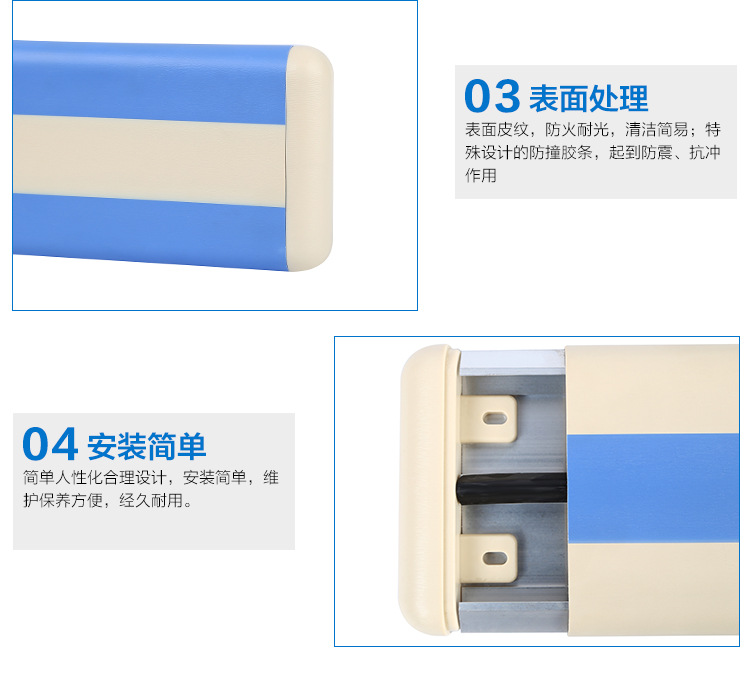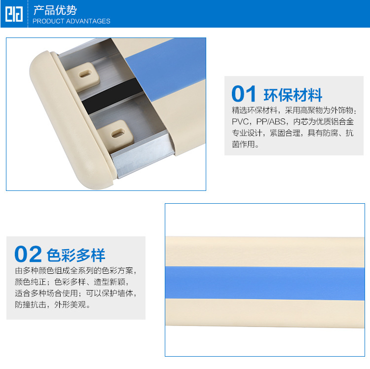 抗菌防撞護板采用高聚物PVC為外飾物,此PVC有防火、防腐、抗菌、易清潔等效果;安裝簡單,津貼墻面,維護保養方便,經久耐用;3、款式多樣,寬窄均可,色彩豐富;護板內芯為優質鋁合金專業設計,緊固合理;表面批文,防火耐光,清潔簡易;抗菌防撞護板和抗菌防撞扶手一起使用,整體保護墻面,防撞、抗擊、抗沖。