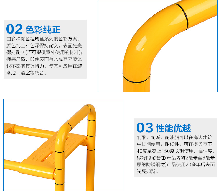 采用4mm厚度的高品質德國尼龍材料,內襯采用304不銹鋼管或優質鋁合金組成;有抗菌、防火、耐磨、耐酸、耐堿、耐油脂及防滑等性能;表面有防滑浮點,產品是能達到食品級的環保材料;有抗沖擊型,產品表面撞擊后不會像金屬管材產生凹痕,不會有任何傷痕;有耐溫性,可以在攝氏零下四十度到零上五十度中長期使用,可為客戶提供配色服務,色彩多樣,整潔美觀,使墻面充滿活力,保養方便、持久耐用。