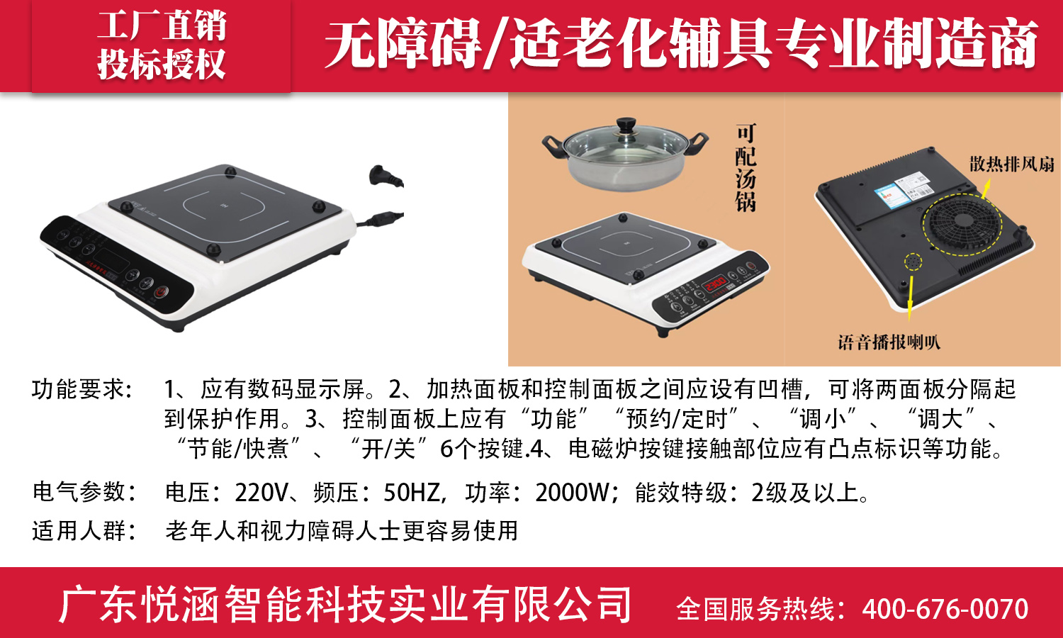 產品應由電磁爐、湯鍋、帶電磁環電源線組成;電磁爐加熱面板材質:耐高溫黑晶防滑面板,耐高溫、沖擊、不易變形、耐用,正面采用防水設計,清潔方便;最高功率不小于2000W,使用時可以按+、-鍵自由調整,十檔火力任意調節;面板上有四個定位柱,可防止鍋滑動。