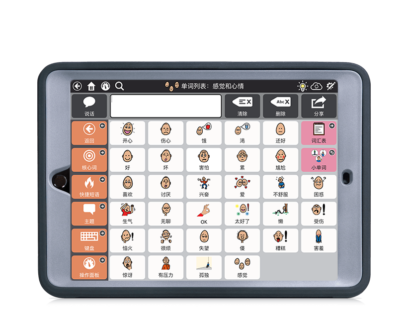 SC溝通平板是一款AAC輔助溝通設備,專為有溝通障礙的人群使用,如自閉癥、腦癱、腦卒中、腦外傷等。 ? 配有手柄和支架,方便用戶攜帶。經過安全測試可承受撞擊和跌落,同時配有防撞角和屏幕保護框架。核心軟件為AAC溝通軟件 TD Snap,通過TD Snap 架起溝通的橋梁,自由表達。