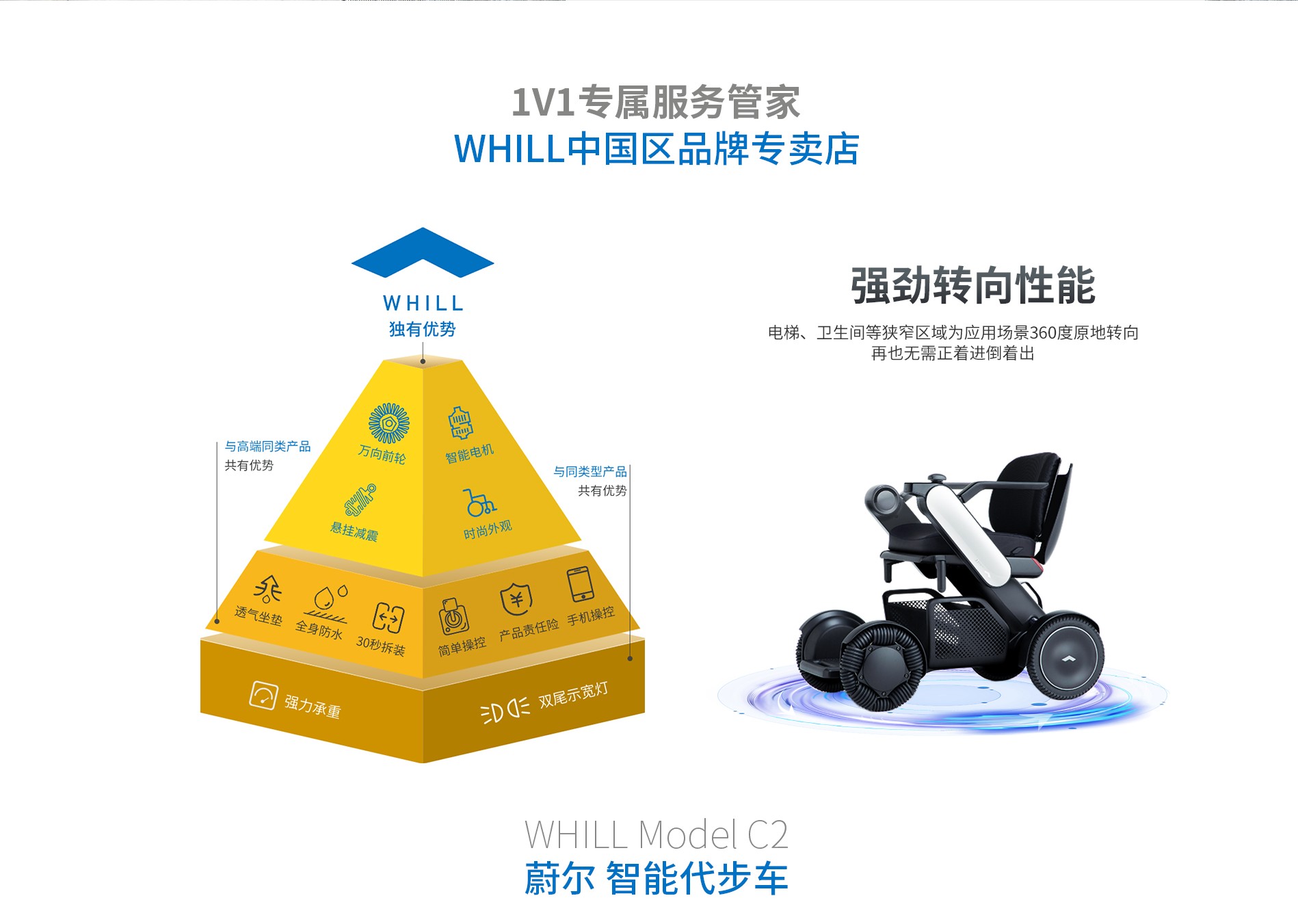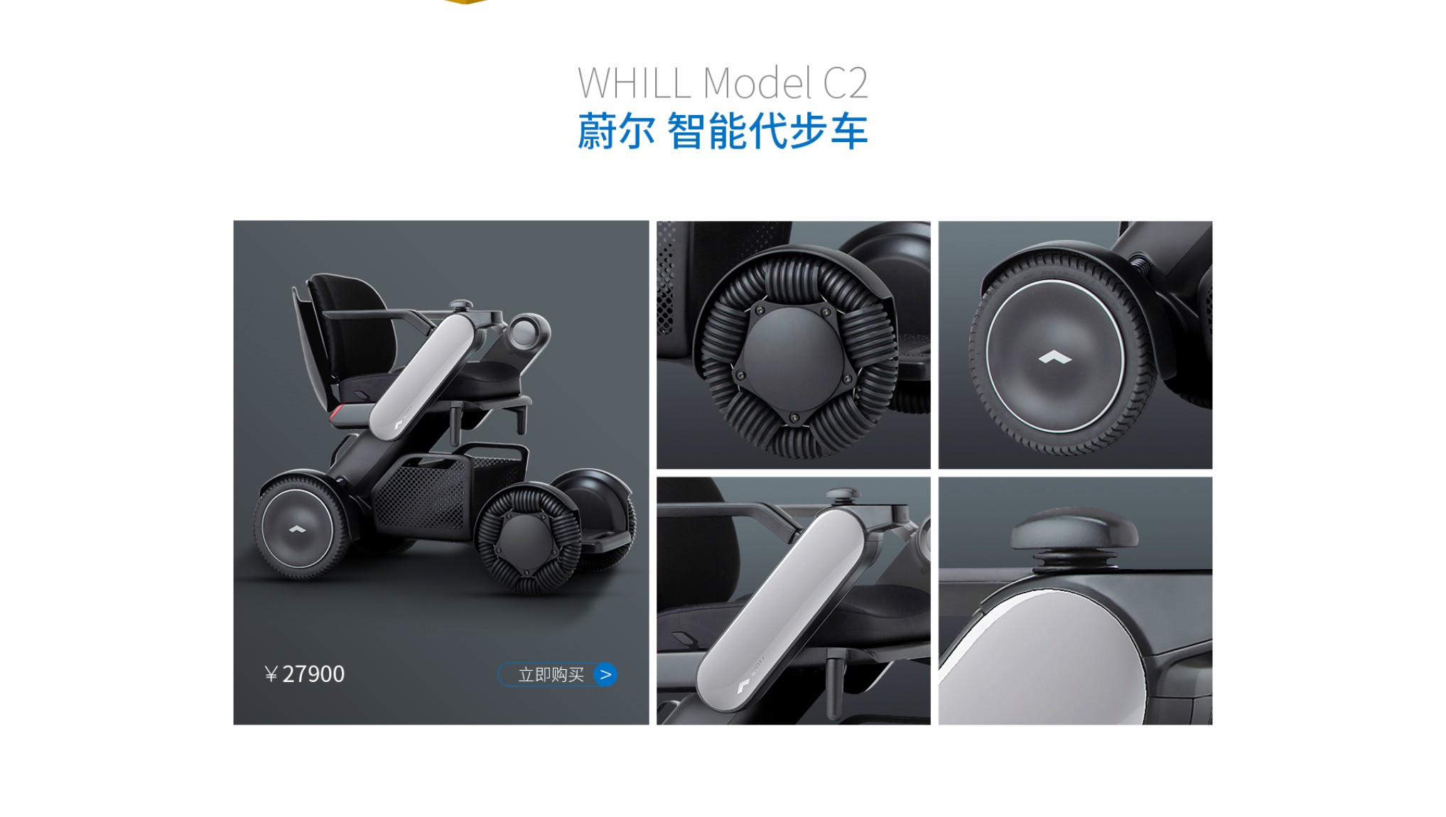 Whill(蔚爾)的使命,為所有人的出行帶來創新和快樂。2009年誕生第一款概念機,2012年WHILL公司在日本建立,經過12年,如今有了MODEL F和C2兩款智能代步車。MODEL C2在2019年全球同步發售,上市后獲得無數大獎。配有日本尼得科無刷雙電機,動力強勁輸出穩定。前輪與馬自達汽車公司開發的特殊專利Omni輪(萬向輪胎),實現原地76厘米半徑轉。彎。