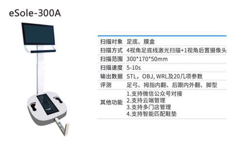 精易迅eSole-300A 足底三維掃描儀是一款專業針對人體足底三維掃描的測量設備,采用非接觸式激光掃描方式,10秒鐘內完成人體足底的三維數據的采集,生成20幾項參數,支持全負重,半負重或無負重足底掃描,可以有效的開展矯形鞋墊設計、個性化定制足墊、科學選鞋、足病診斷和足病矯正等多種工作;廣泛應用于醫療、體育、鞋店零售等領域