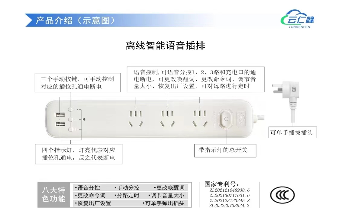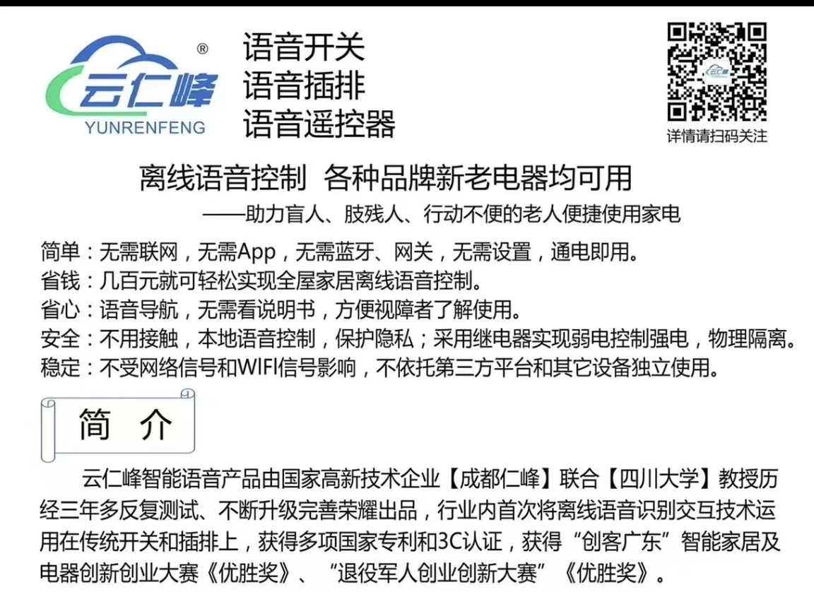 離線語音控制 各種品牌新老電器均可用 ——助力盲人、肢殘人、行動不便的老人便捷使用家電 簡單:無需聯網,無需App,無需藍牙、網關,無需設置,通電即用。 省錢:幾百元就可輕松實現全屋家居離線語音控制。 省心:語音導航,無需看說明書。 安全:不用接觸,本地語音控制,保護隱私;采用繼電器實現弱電控制強電,物理隔離。 穩定:不受網絡信號和WlFl信號影響,不依托第三方平臺和其它輔助設備獨立使用。