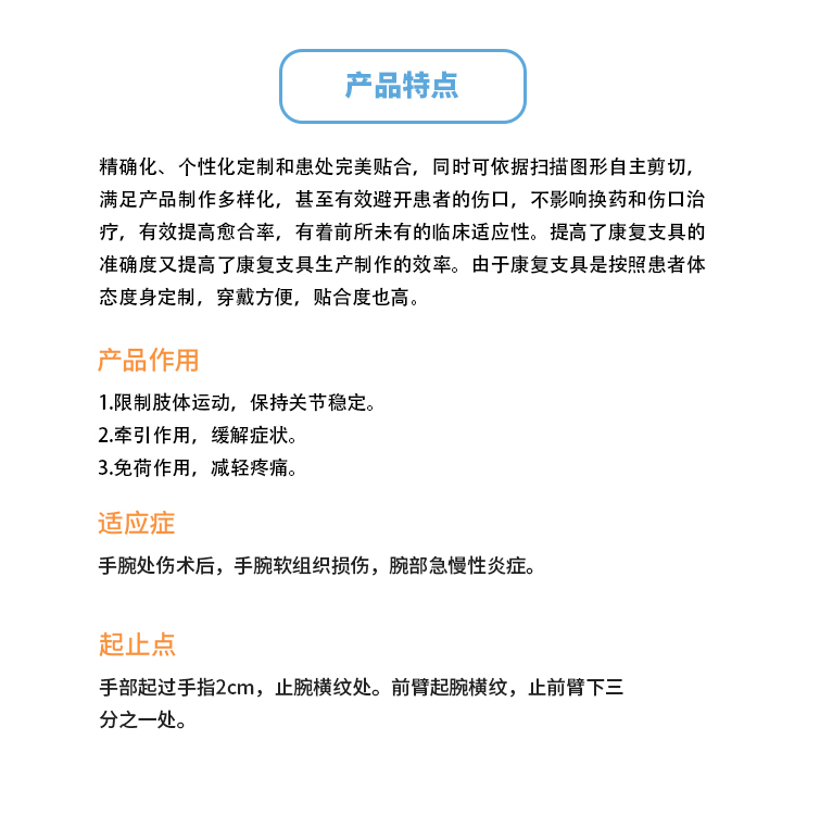 產品特點 精確化、個性化定制和患處完美貼合,同時可依據掃描圖形自主剪切,滿足產品制作多樣化,甚至有效避開患者的傷口,不影響換藥和傷口治療,有效提高愈合率,有著前所未有的臨床適應性。提高了康復支具的準確度又提高了康復支具生產制作的效率。由于康復支具是按照患者體態度身定制,穿戴方便,貼合度也高。 產品作用 1.限制肢體運動,保持關節穩定。 2.牽引作用,緩解癥狀。 3.免荷作用,減輕疼痛。