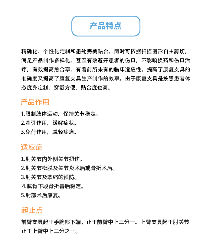 產品特點 精確化、個性化定制和患處完美貼合,同時可依據掃描圖形自主剪切,滿足產品制作多樣化,甚至有效避開患者的傷口,不影響換藥和傷口治療,有效提高愈合率,有著前所未有的臨床適應性。提高了康復支具的準確度又提高了康復支具生產制作的效率。由于康復支具是按照患者體態度身定制,穿戴方便,貼合度也高。 產品作用 1.限制肢體運動,保持關節穩定。 2.牽引作用,緩解癥狀。 3.免荷作用,減輕疼痛。