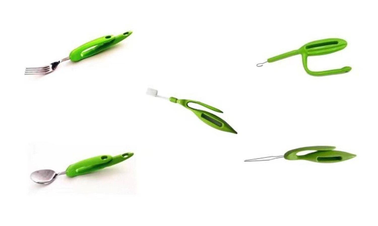 套裝由記憶成人勺子、記憶成人叉子、記憶成人牙刷、拉鏈輔助器、穿扣器5種產品組成。這些產品手柄材質為形狀記憶聚合物,握柄可多次加熱軟化重新塑型,握柄的材質無毒、無害、抗菌環保、易于清潔、不易退色。適用于手關節僵直、變形,身體活動障礙人群使用。