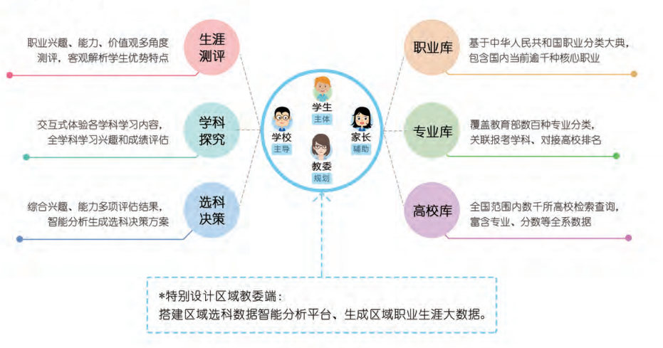 核心功能: 通過霍蘭德興趣測評量表、多元智能測評量表、MBTI職業性格測評量表、WVI職業價值觀測試量表進行興趣、能力、性格和價值觀的綜合分析,科學測評系統和完善的報告,智能推薦適合學科及專業職業 從選科決策、專業定位、職業方向到生涯規劃,形成完整的學業與生涯規劃路徑。從離學生最近的學科選擇開始生涯之路的規劃,與學生的生活更接軌。大數據報告,幫助老師快速掌握全校學生的選擇意象。豐富的資源庫內容