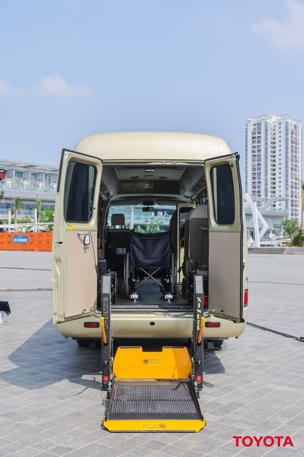 輕型客車,汽油(92#),4.0L V6,5擋MT,9座(含駕駛位)正常座位5個,輪椅位4個,車后雙開門,搭載國產“信德泰克” 升降平臺,輪椅可直接進入車內,車內配有輪椅固定裝置輪椅從后方乘車時,升降平臺上升需30s;固定輪椅:3min/輪*4 個輪椅=12min。通過升降平臺輔助乘車,適用于老年人、輪椅使用人士、殘疾人、機構用。