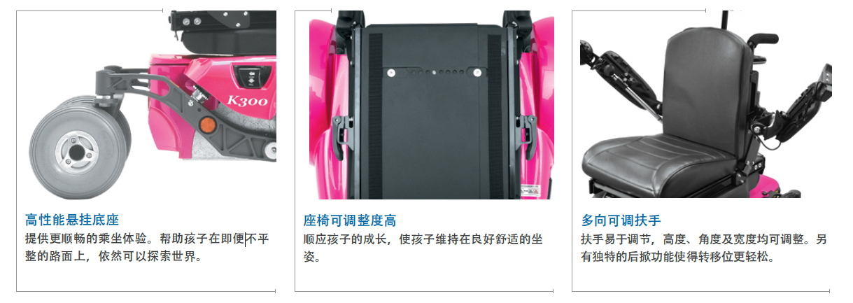 【功能】: 電動前進、后退、座椅抬升、座椅空中傾倒 【用途】: 本品供行動有困難的兒童或身材矮小的成年人使用,輔助用戶實現部分的行動功能。 【原理】: 輪椅由底盤、座椅和控制面板組成。底盤包括輪椅的電子裝置、前輪(驅動輪)、后輪和支撐輪。座椅包括靠座架、座板和靠背、扶手、擱腳和踏板、座椅升降裝置。本品通過電池電力驅動,用戶可以通過控制面板(控制器)控制電動輪椅車的前進、后退、抬升、空中傾倒等。