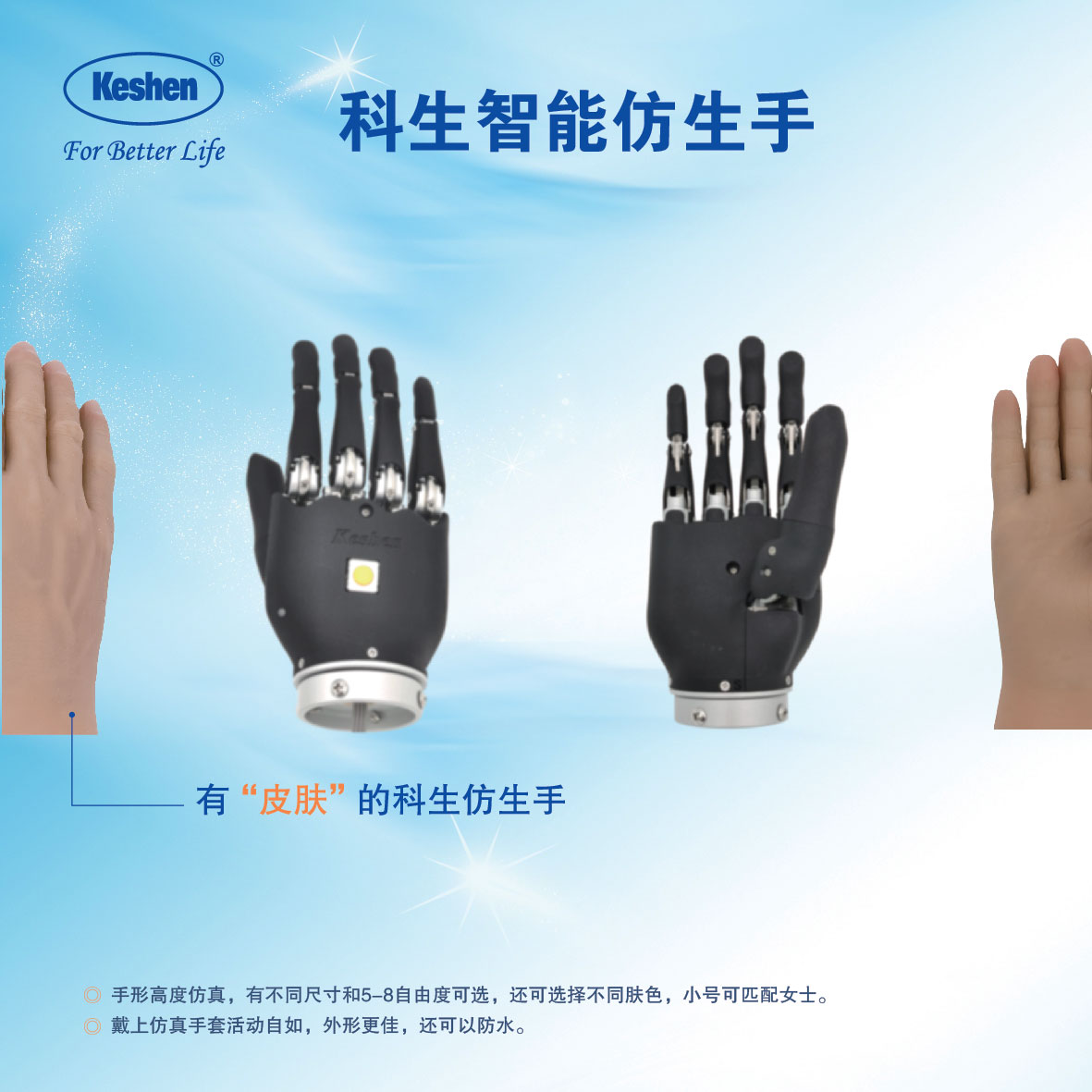 ◎可靠智能識別肌電信號,不用切換,有1至8通道多種控制模式。◎創新的智能識別的實時控制創新仿生手可主動屈腕,功能更強,雙前臂截肢者如廁無隨礙。◎手形高度仿真,有不同尺寸和5-8自由度可選,還可選擇不同膚色,小號可匹配女士?!虬惭b方法與普通肌電手相同,非常簡單,容易維護?!虼魃戏抡媸痔谆顒幼匀?,外形更佳,還可以防水。