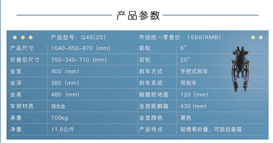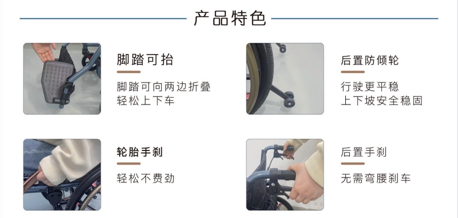 1、鎂合金大輪手推輪椅,推行超輕松,凈重11公斤 2、左右對折腳踏,可上翻,方便上下車 3、可自劃,可推行 4、前后雙剎車,安全穩定 5、加長防傾輪,有效防止傾倒