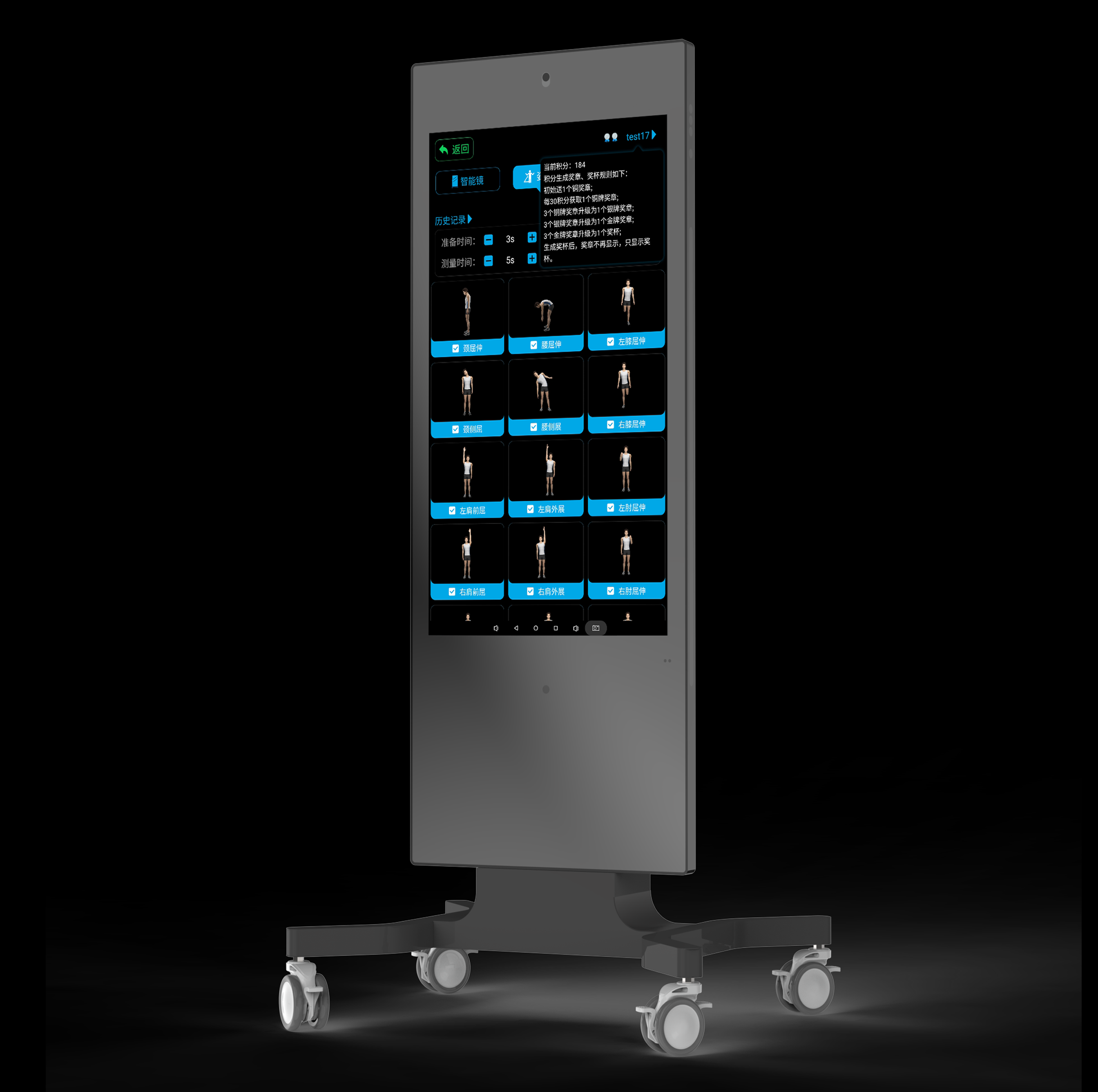 智能矯正鏡,使用自研AI算法,智能分析人體關鍵點數據,進行精準展示及評估。機器視覺處理,無需佩戴其他裝置,即時采集人體數據可進行關節活動類 評估、體態姿勢分析、運動過程監測和體質健康測量,助力傳統設備提檔升級, 讓治療訓練有據可循,量表統計直觀可見,增強康復意愿。