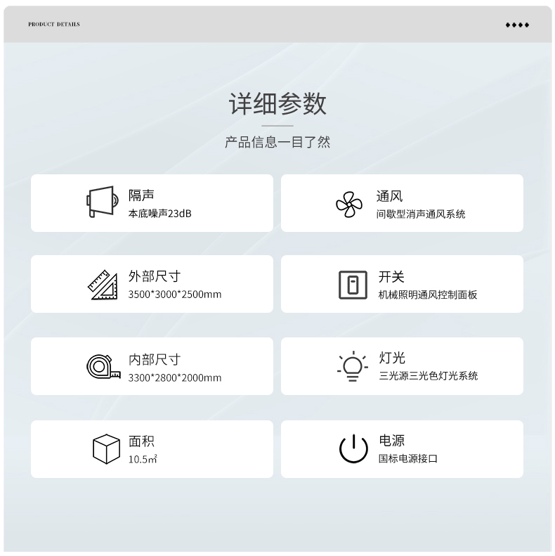 型號:L350 隔聲:室外環境噪聲≤55dB (A),室內本底噪聲≤23dB (A) 環保:甲醛釋放量≤0.4mg/L,滿足《室內裝飾裝修材料及人造板棉制品中甲醛釋放量》 參考標準: JJF 1191-2019《測聽室聲學特性校準規范》 GB 3096-2022《聲環境質量標準》 GB 50325-2020《民用建筑工程室內環境污染控制標準》 適用范圍:純音測聽、言語測聽、兒童聽覺言語檢測評估