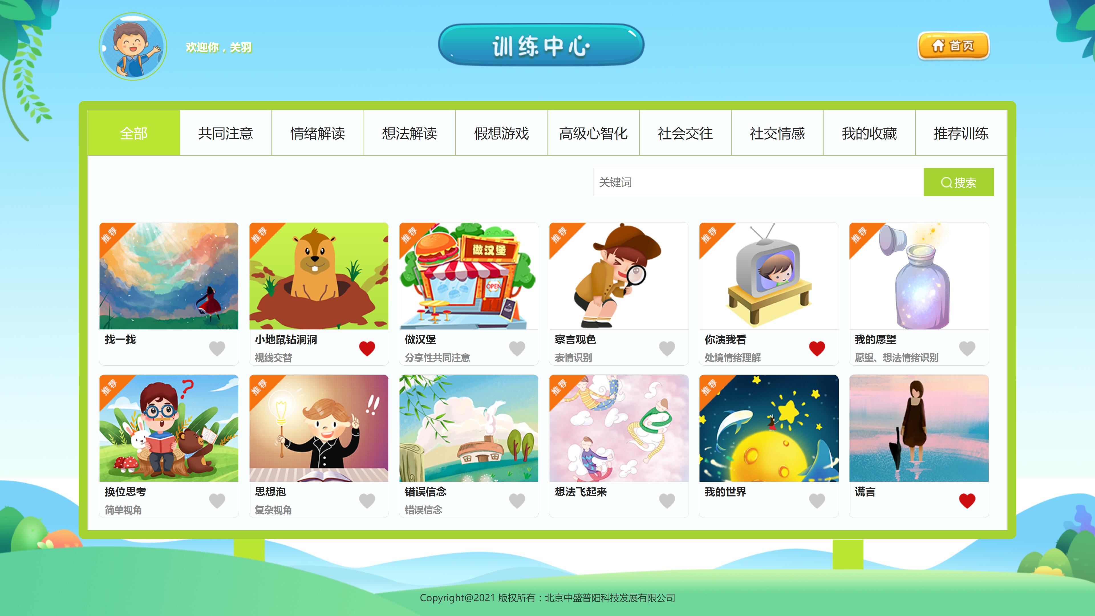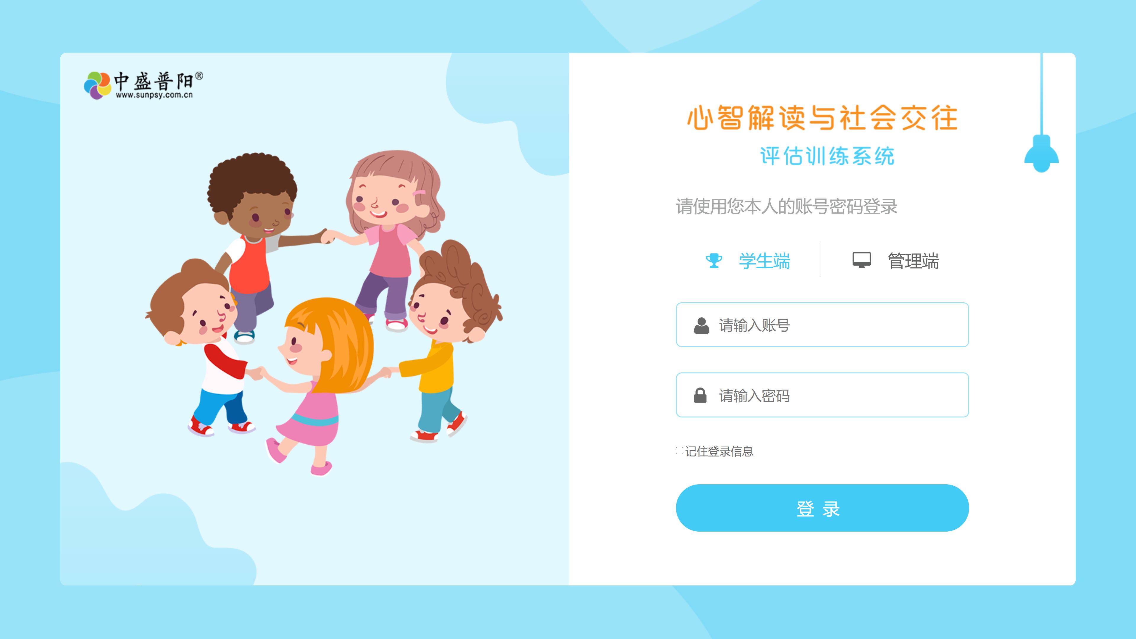 包含針對特殊兒童心智解讀與社會交往能力的評估與訓練內容,軟件適用于認知能力達到兩歲以上水平的、心智化發展能力落后、社交及溝通能力較弱的兒童及自閉癥兒童。 系統集檔案管理、評估中心、訓練中心、個性化方案管理、資源中心、系統管理、個人中心、個性化方案等功能于一體。 軟件的評估部分提供心智解讀能力觀察評估表、社交技能評定量表等專業評估工具。