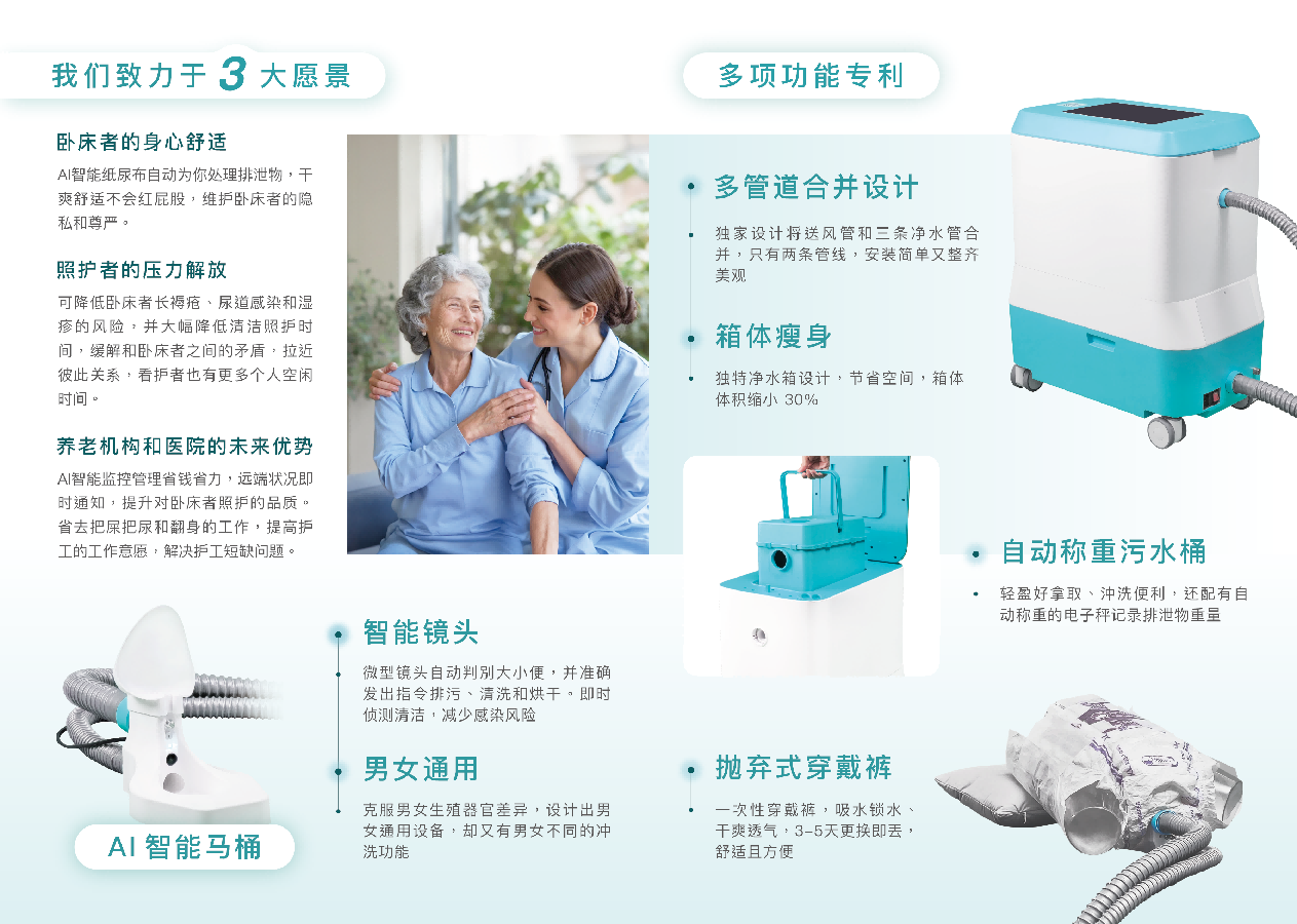 笑籽排泄機器人也稱為AI智能紙尿布,是專為臥床失能病人設計的產品,在床上用的智能馬桶,由AI智能識別大小便,自動啟動不同的模式為使用者清潔大小便,并且沖洗烘干,還會拍照記錄排泄物的樣態、時間和重量,協助了解使用者的情況。特制專用的一次性尿布,用兩三天丟棄,干凈輕松方便。AI可以啟動排尿、頻尿和排便不同模式沖洗烘干,達到省水省電的效益。