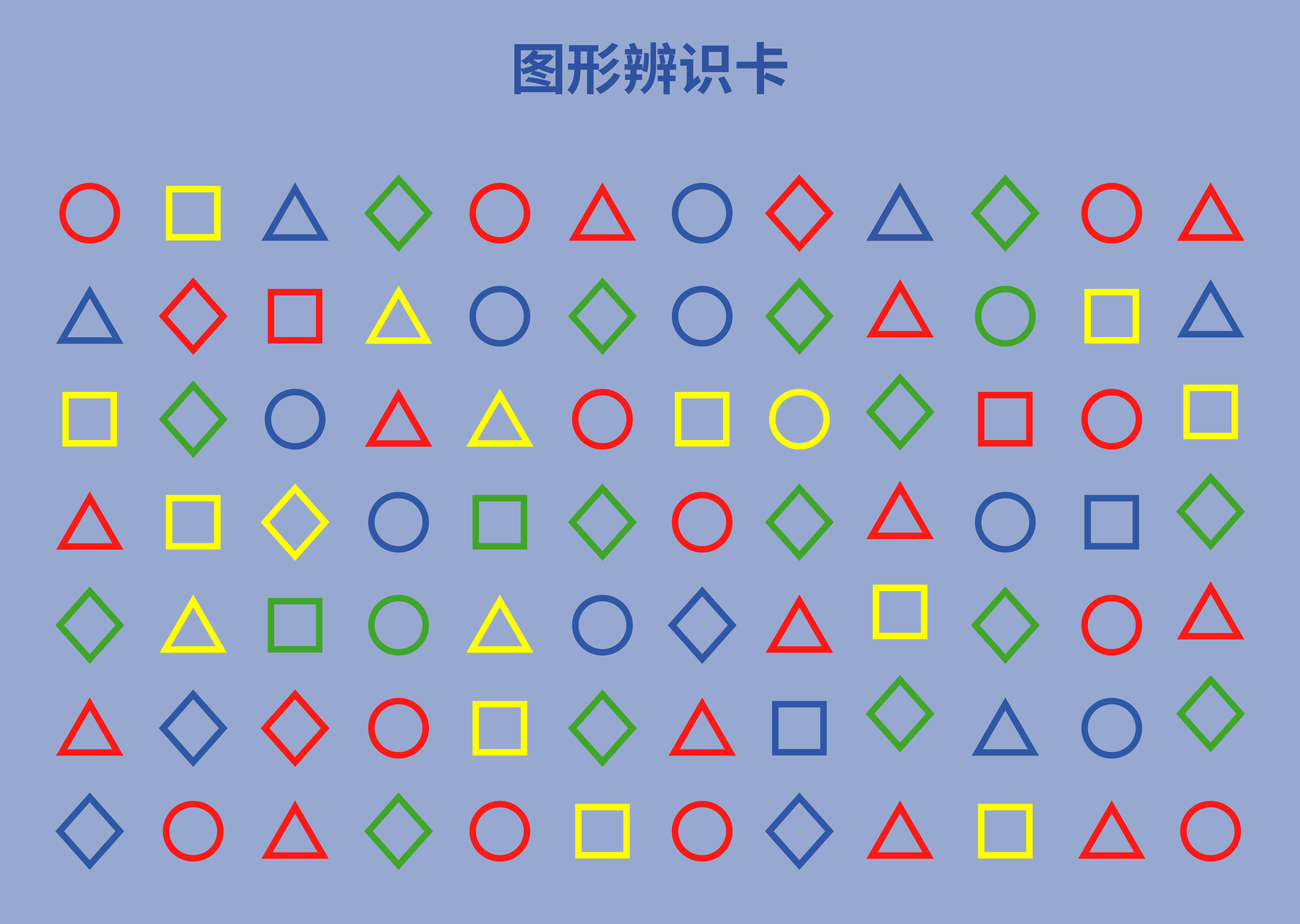 圖形辨識卡是一張訓練卡,7行12列,上面分別以圓形、三角形、正方形、菱形,四種圖形呈現。它的游戲規則是當遇到圓形時拍手1下,當遇到正方形時拍桌子1下,當遇到三角形時拍腿1下,當遇到菱形時連拍手2下,訓練循序漸進展開,直到老年人能獨立完成整套訓練卡游戲。通過圖形辨識卡,能有效鍛煉老人的手指靈活性,提升老人的空間感和反應力,鍛煉大腦活力和認知水平。