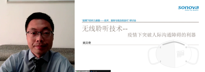 中國聾人協會信息無障礙委員會副主任、索諾瓦(Sonova)聽力全國項目技術經理姚文奇先生為大家分享了“疫情下突破人際溝通障礙的利器——無線聆聽技術”的細節。