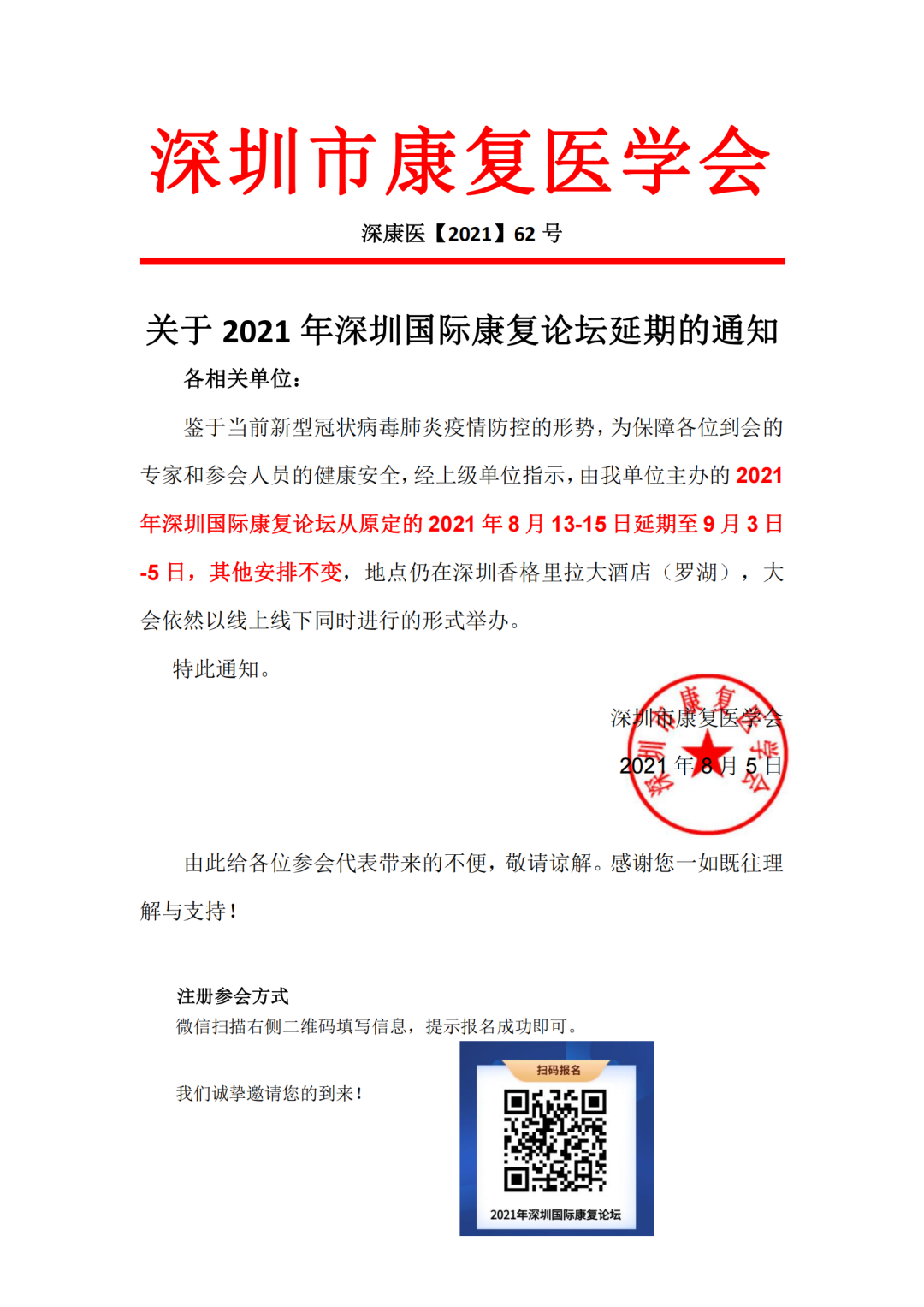 鑒于當前新型冠狀病毒肺炎疫情防控的形勢,為保障各位到會的專家和參會人員的健康安全,經上級單位指示,2021年深圳國際康復論壇從原定的2021年8月13-15日延期至9月3日-5日,其他安排不變,地點仍在深圳香格里拉大酒店(羅湖),大會依然以線上線下同時進行的形式舉辦。由此給各位參會代表帶來的不便,敬請諒解。