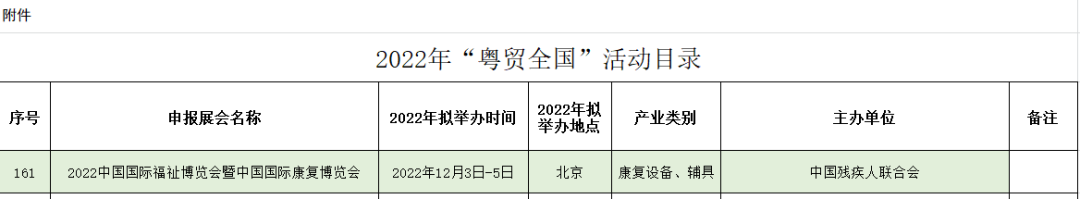 廣東省商務廳近日公布2022年“粵貿全國”名錄,經申報及專家評審,2022中國國際福祉博覽會暨中國國際康復博覽會(CR EXPO)成功入圍2022年“粵貿全國”系列展會!