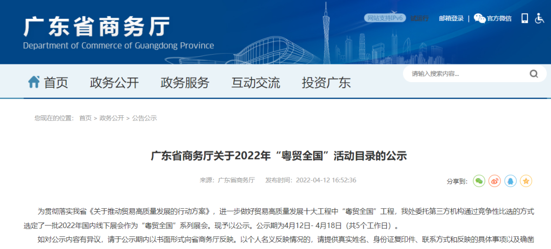 為進一步做好貿易高質量發展十大工程中“粵貿全國”工程,廣東省商務廳委托第三方機構通過競爭性比選的方式選定了一批2022年國內線下展會作為“粵貿全國”系列展會。