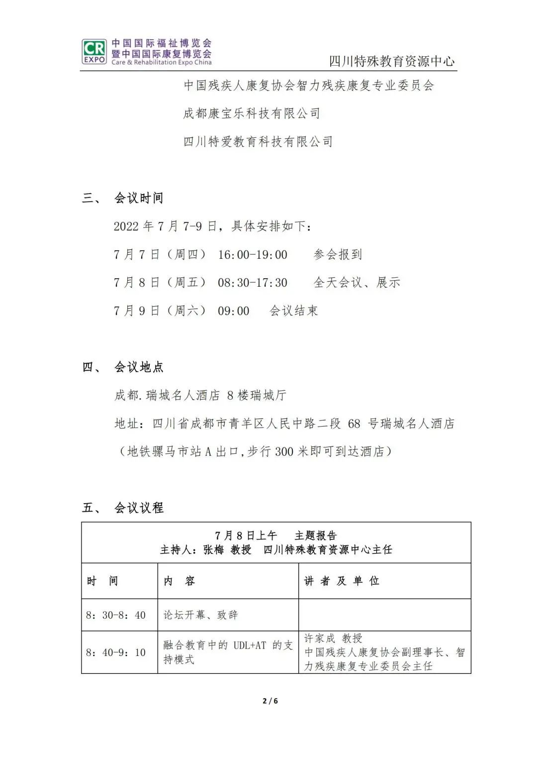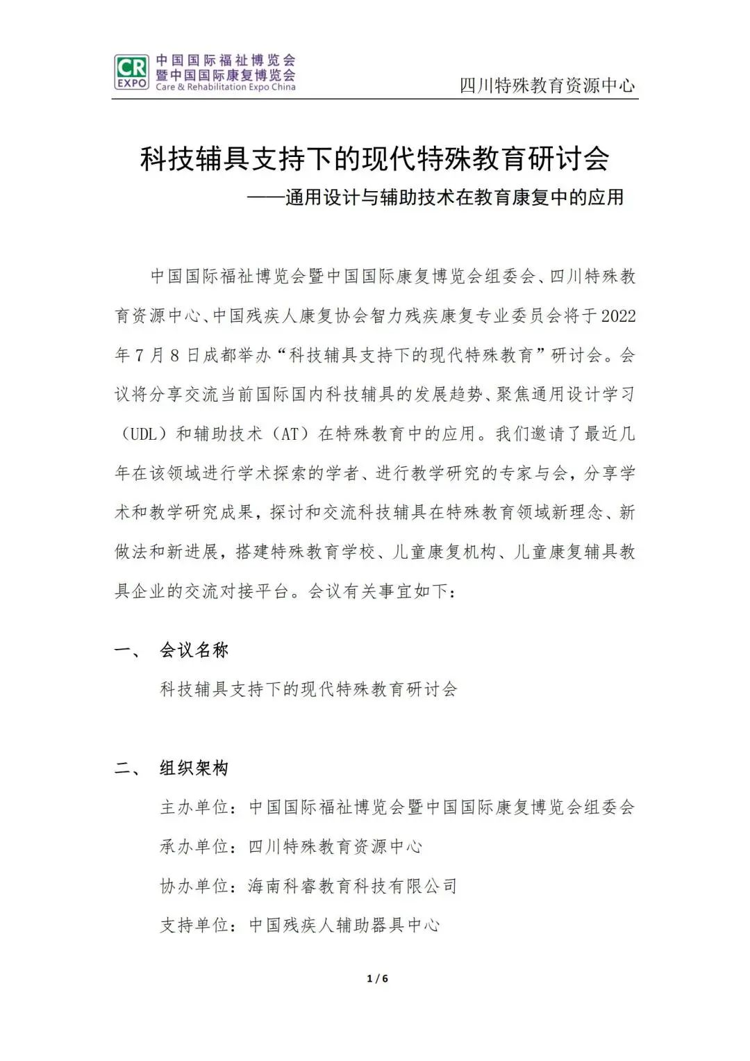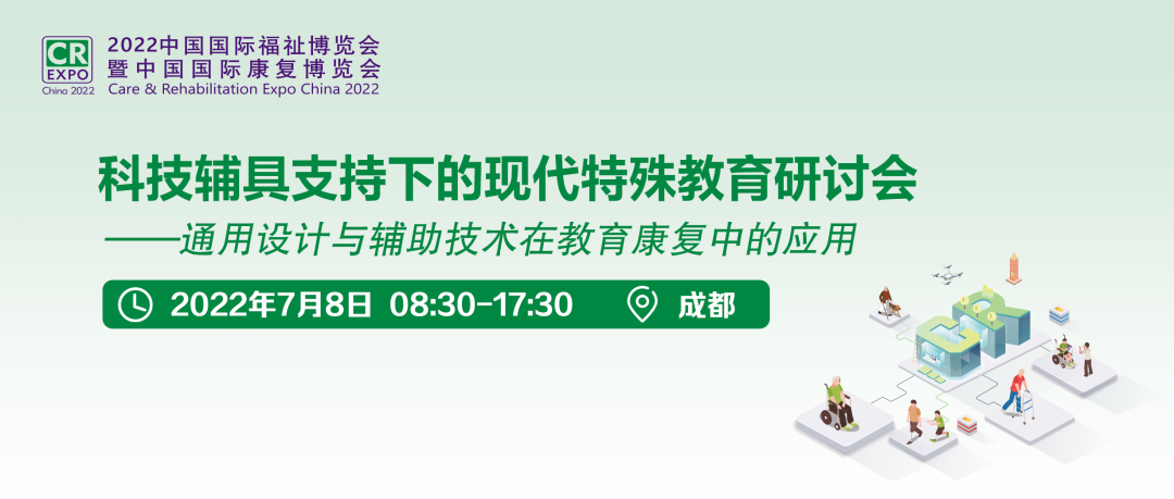 基于此,中國國際福祉博覽會暨中國國際康復博覽會組委會聯合四川特殊教育資源中心、中國殘疾人康復協會智力殘疾康復專業委員會,將于2022年7月8日在成都舉辦“科技輔具支持下的現代特殊教育”研討會,邀請專家學者分享學術和教學研究成果,探討和交流科技輔具在特殊教育領域新理念、新做法和新進展,搭建特殊教育學校、兒童康復機構、兒童康復輔具教具企業的交流對接平臺。會議詳情如下: