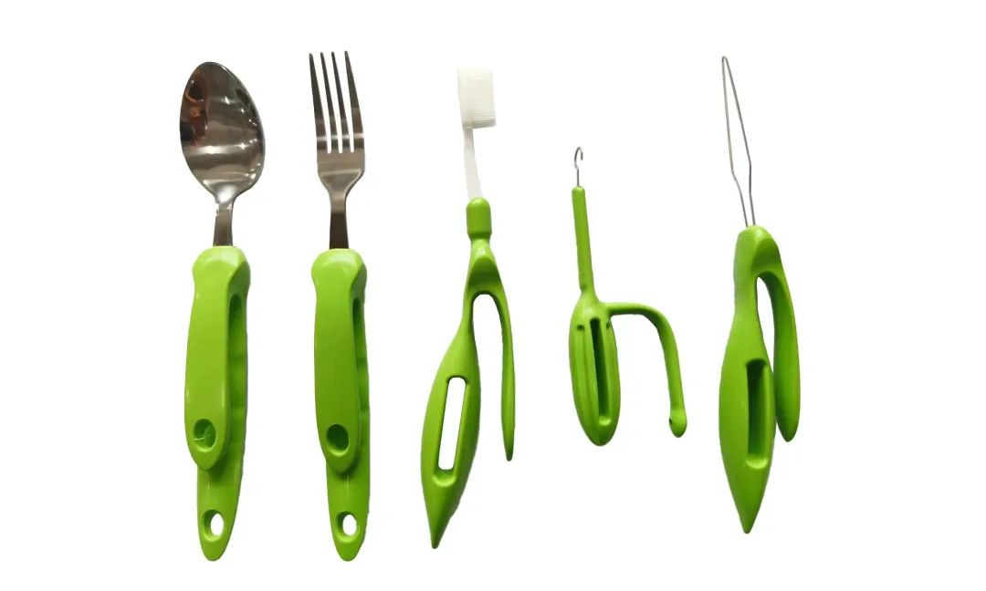 套裝由記憶成人勺子、記憶成人叉子、記憶成人牙刷、拉鏈輔助器、穿扣器5種產品組成。這些產品手柄材質為形狀記憶聚合物,握柄可多次加熱軟化重新塑型,握柄的材質無毒、無害、抗菌環保、易于清潔、不易退色。適用于手關節僵直、變形,身體活動障礙人群使用。