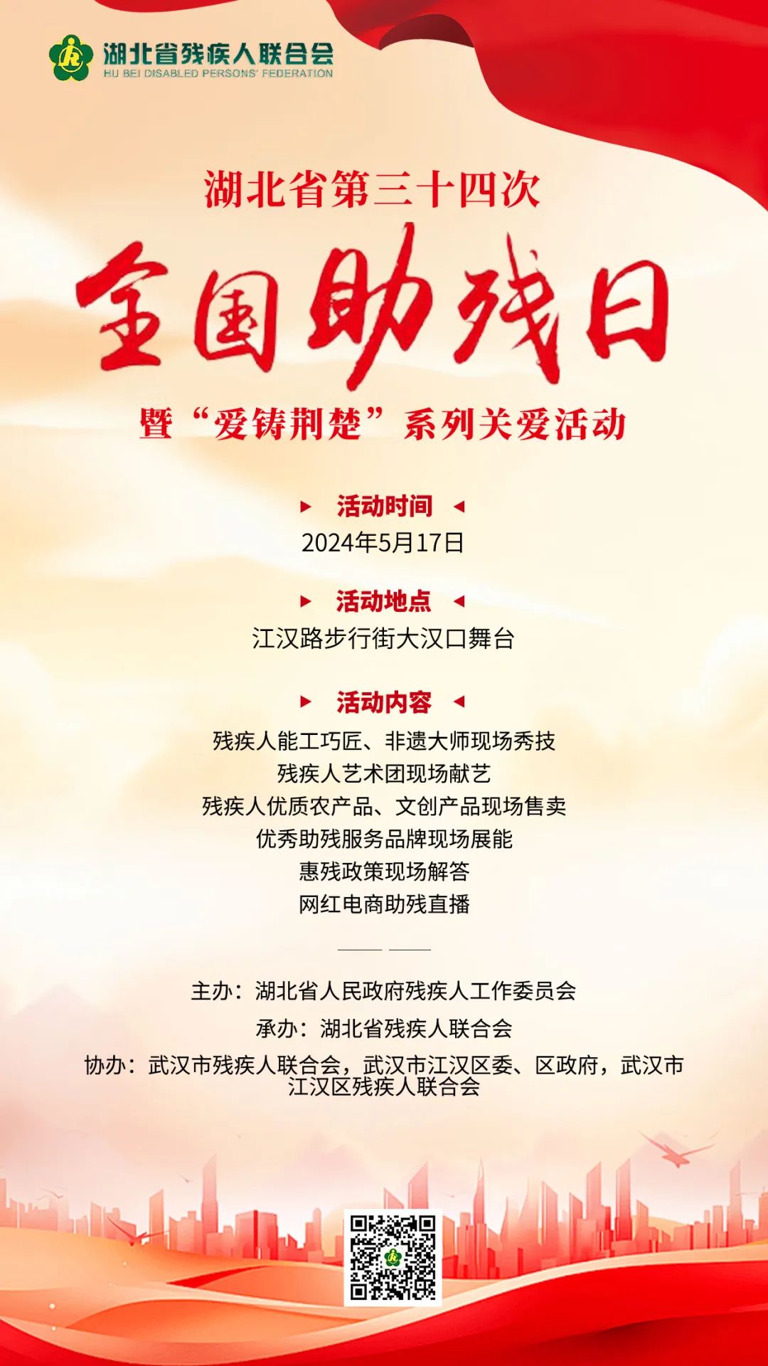 5月17日,湖北省第三十四次“全國助殘日”暨“愛鑄荊楚”系列關愛活動將在江漢路步行街大漢口舞臺溫情開啟。