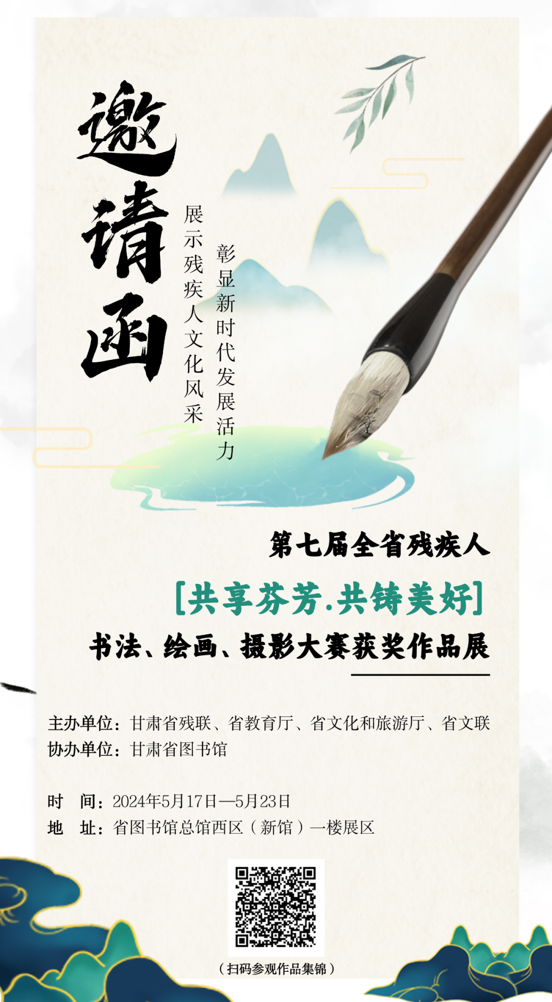 5月17——23日,甘肅殘聯將舉辦第七屆全省殘疾人“共享芬芳·共鑄美好”書法、繪畫、攝影大賽獲獎作品展。