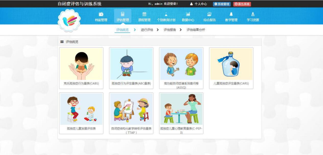 系統內置了如:TTAP、C-PEP-3等國內外權威的評估工具,涵蓋了從幼兒到成人的不同年齡階段的自閉癥人群的評估需求。并根據自閉癥人群的信息加工特點研發了感知覺、社會交往、語言溝通等八大維度的訓練內容,教師可以根據學生情況設置有針對性的課程,制定個別教育計劃,提高了教師的工作效率與工作質量,搭建起家校溝通的橋梁。