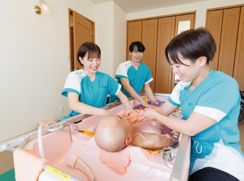 到宅沐浴工作人員3~4人(其中1人為護士)攜帶簡易浴缸上門提供特殊沐浴的服務。乘車拜訪客人的家,在家中安全空間內組裝便攜式浴缸,給客人洗澡。