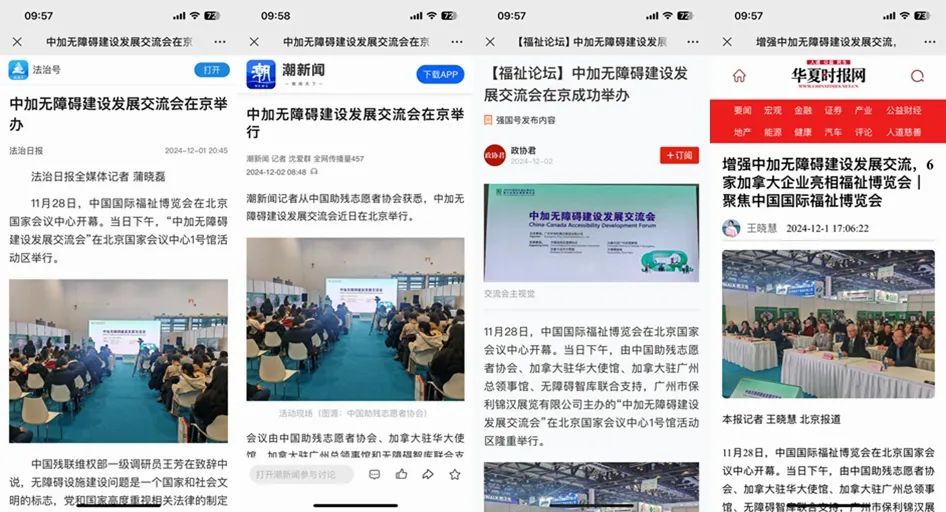 2024年11月28日,中國國際福祉博覽會在北京國家會議中心開幕。當日下午,由中國助殘志愿者協會、加拿大駐華大使館、加拿大駐廣州總領事館、無障礙智庫聯合支持,廣州市保利錦漢展覽有限公司主辦的“中加無障礙建設發展交流會”在北京國家會議中心1號館活動區隆重舉行。