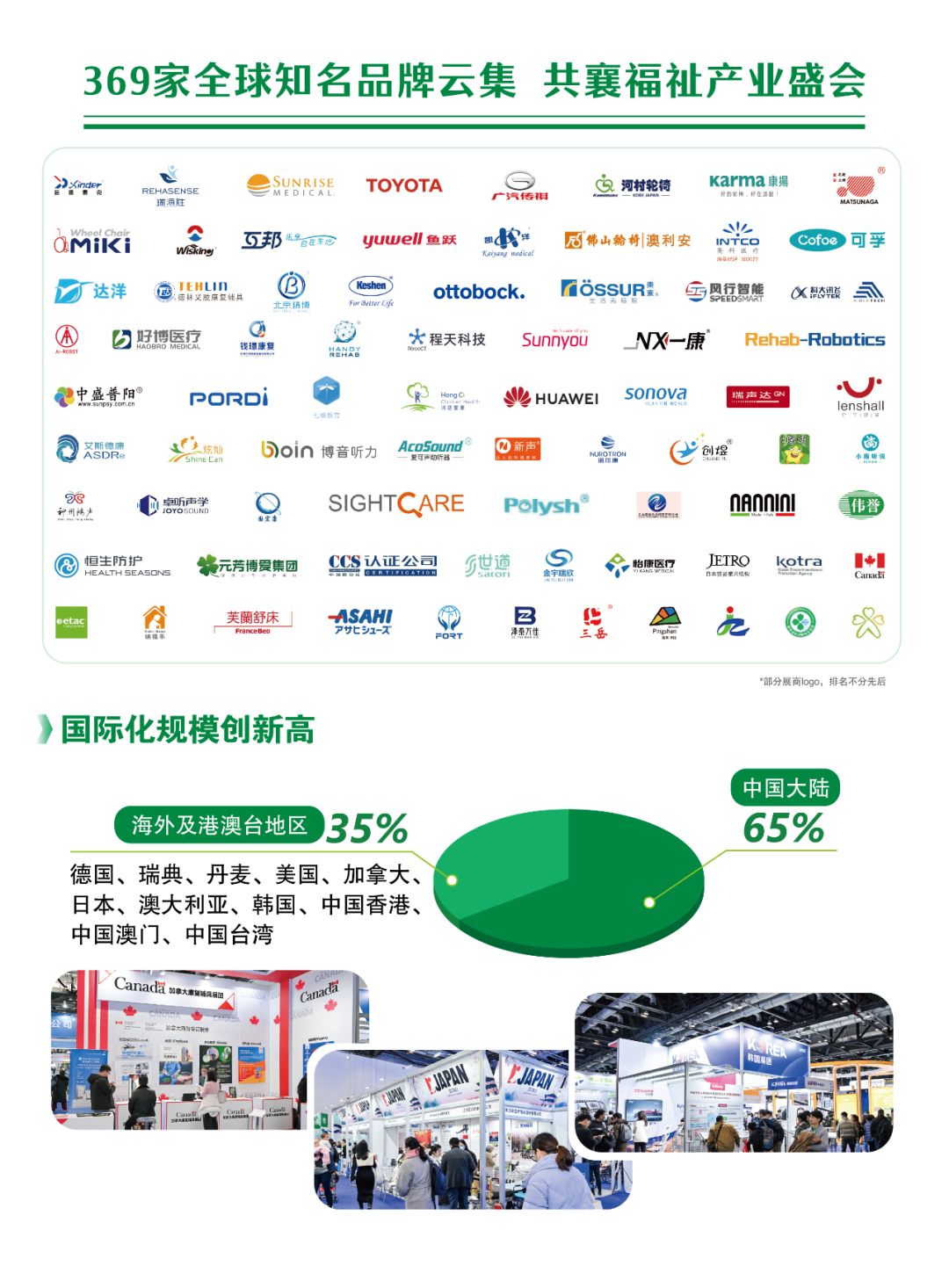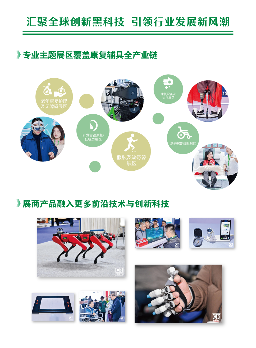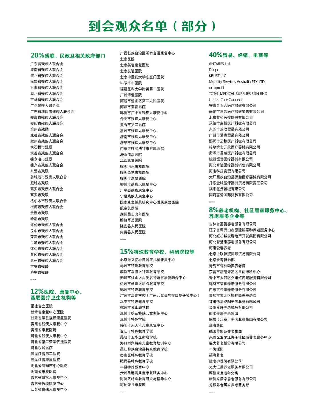 助行移動輔具展區 假肢及矯形器展區 醫療器械/康復展區 聽覺言語康復與低視力展區 老年用品及護理/無障礙展區 海外展區